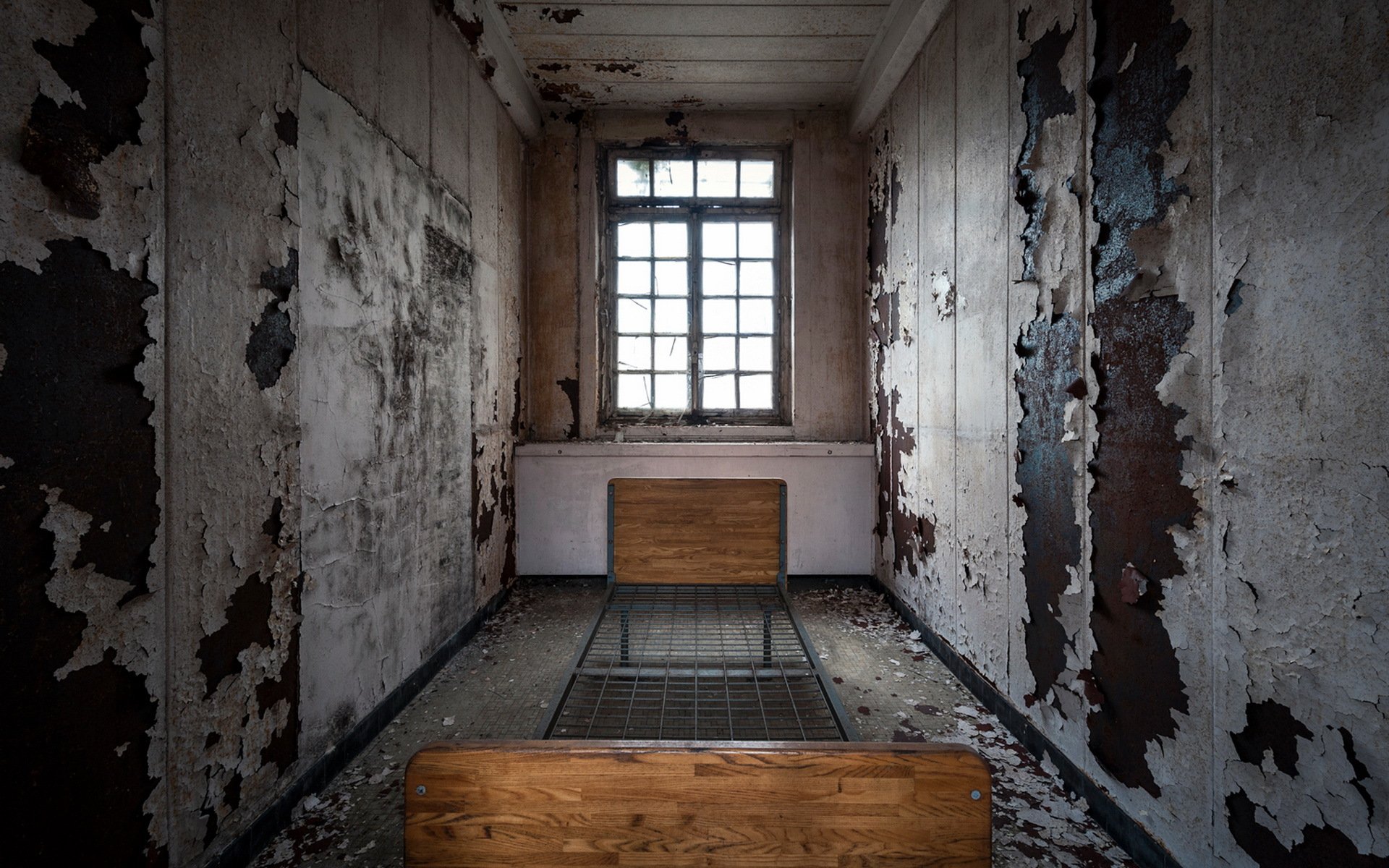 An abandoned room with a bed near the door