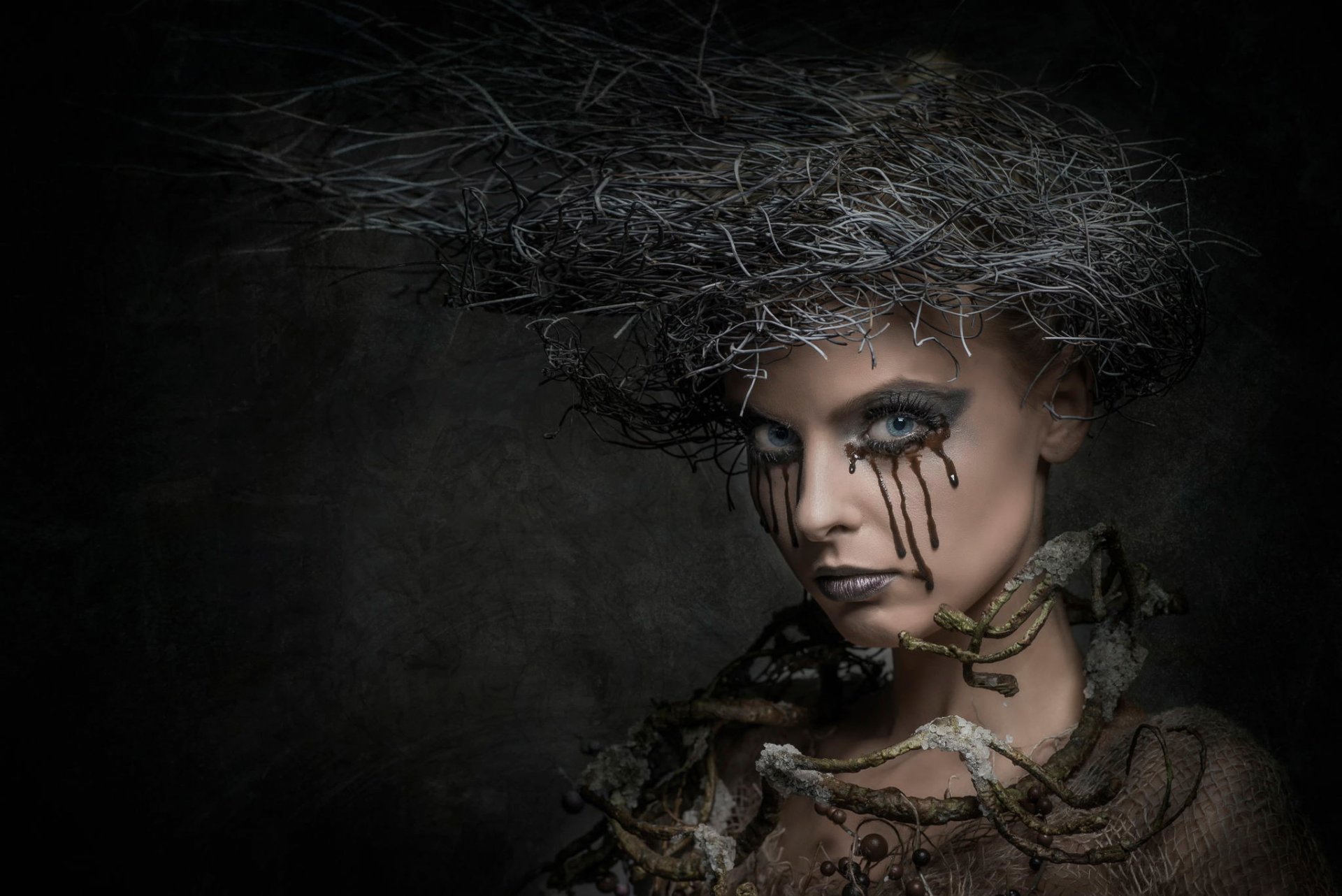 Image of a woman's head on a black background in luminous splashesImage of a woman's head on a black background in luminous splashes
