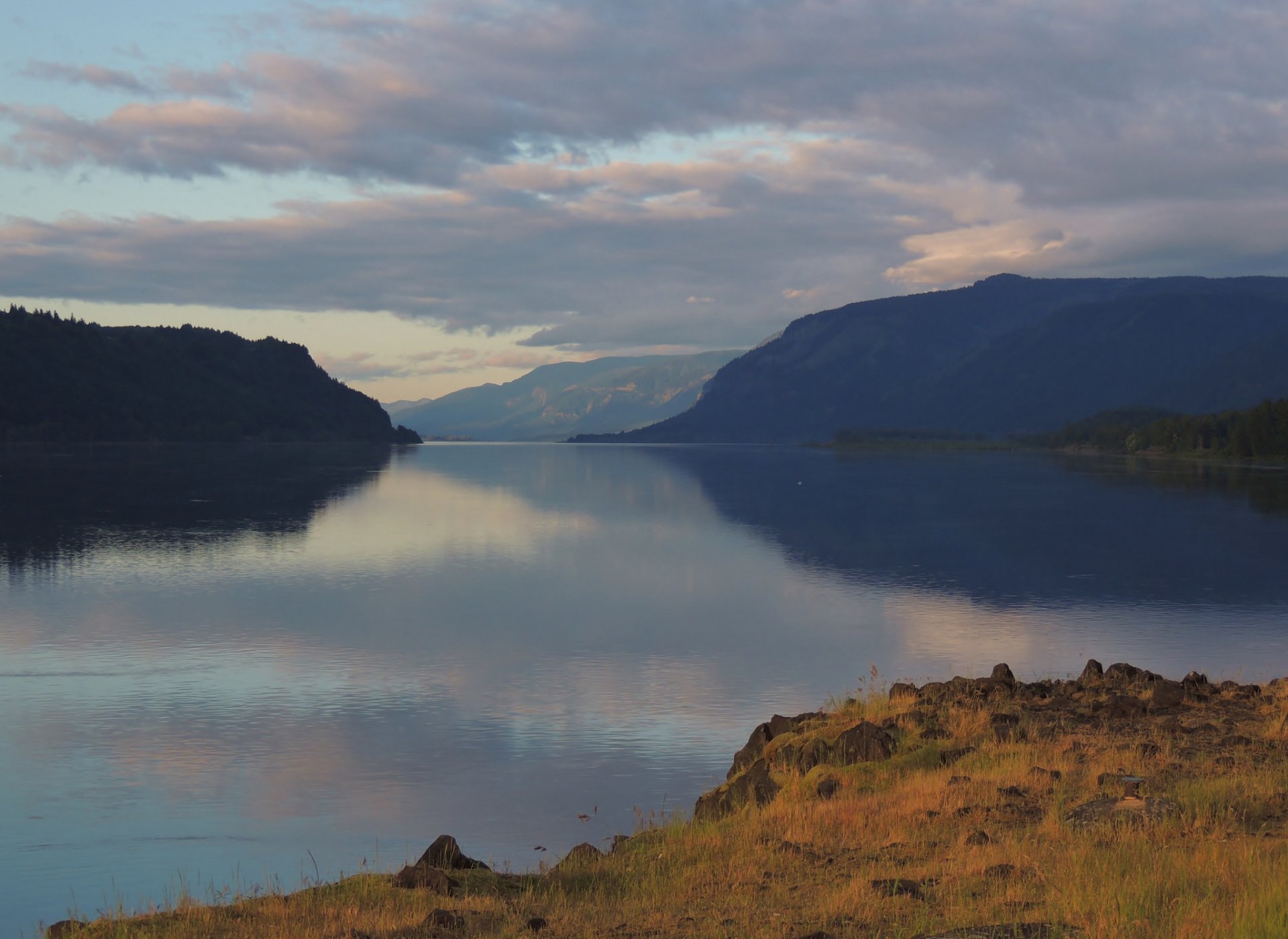 Mountain lake with black stones on the shore