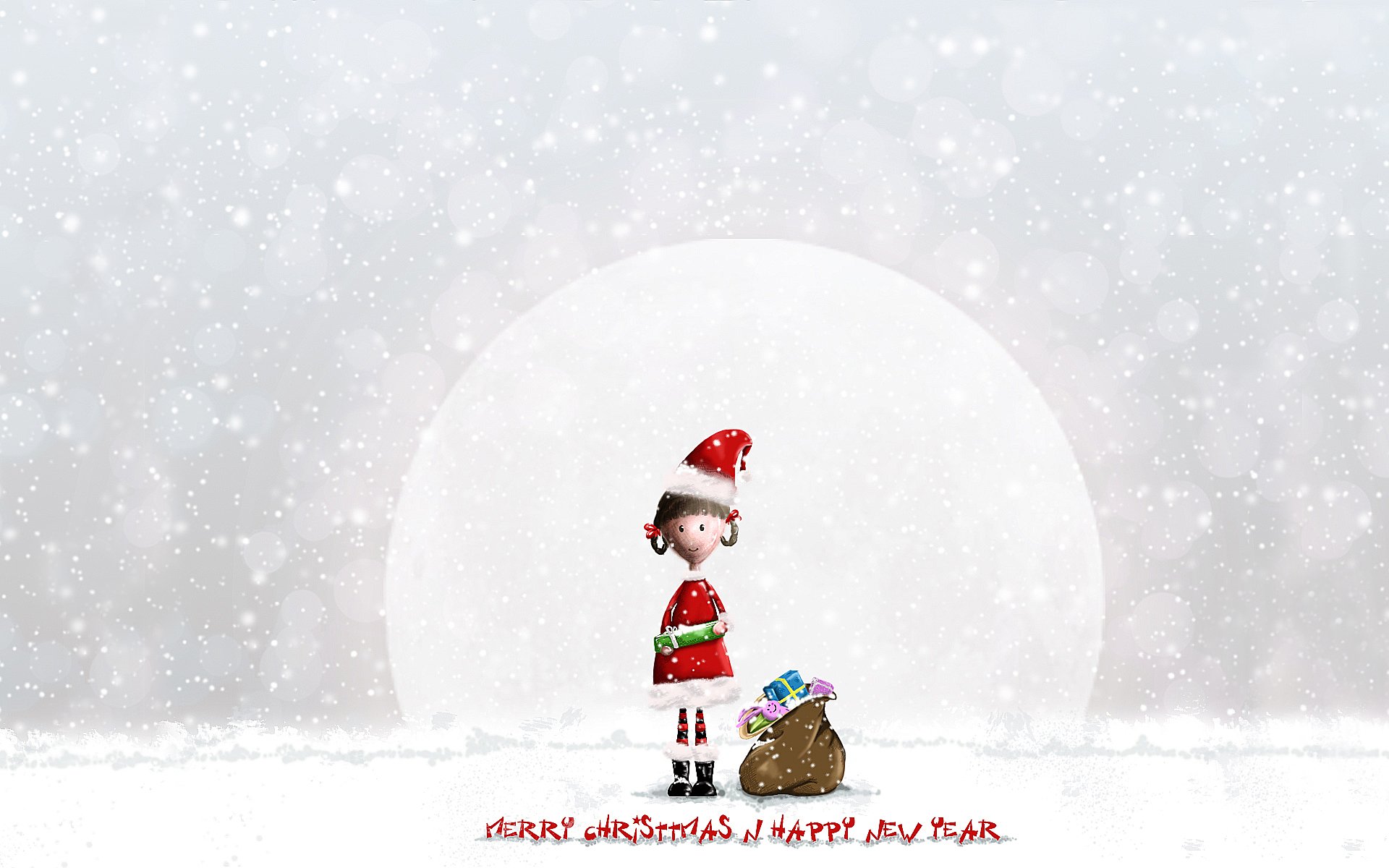 A girl in a christmas costume and with a bag of giftsA girl in a Christmas costume and with a bag of gifts
