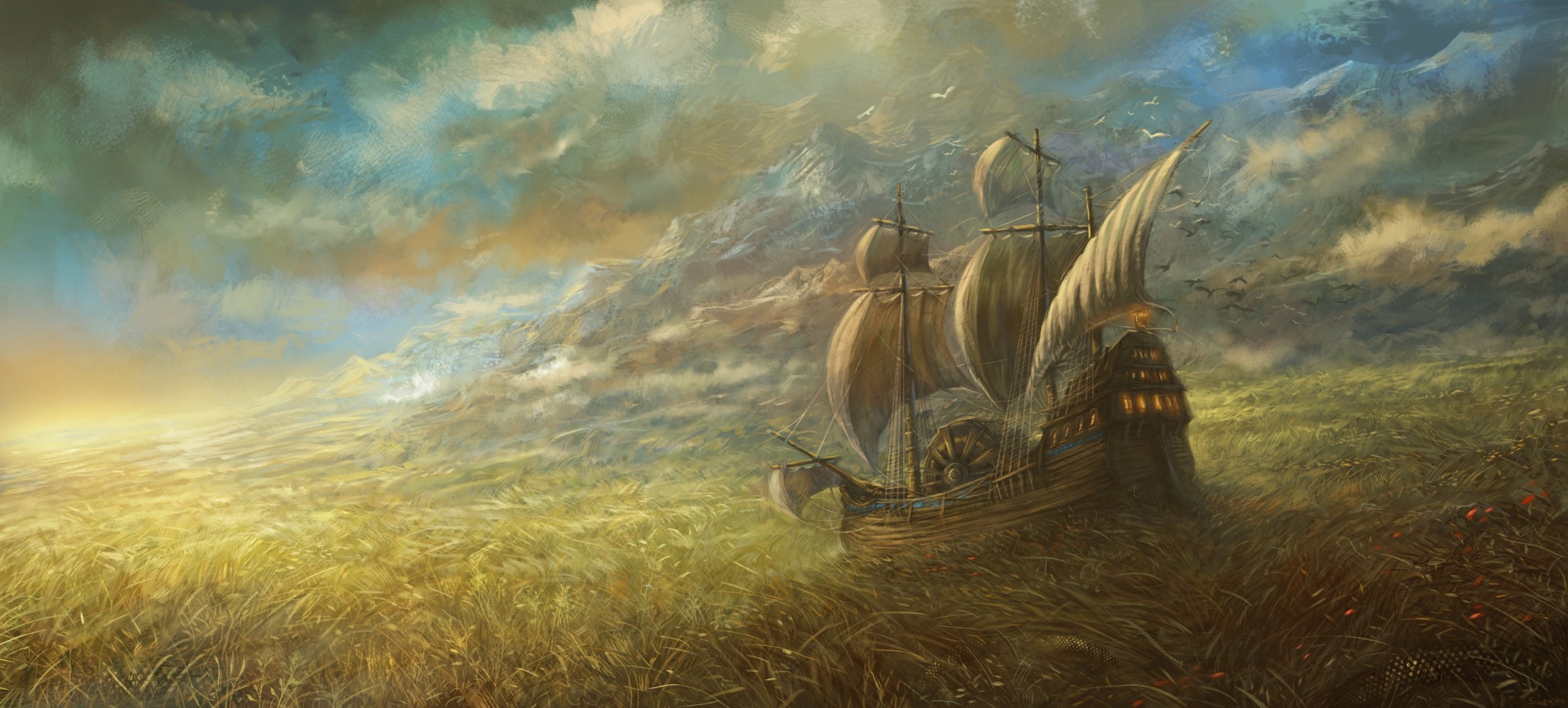 A sail floats through the cave behind a small shipA sail floats through the cave behind a small ship