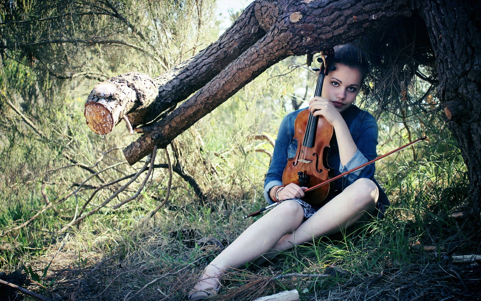 The girl is sitting in the grass and playing the violinThe girl is sitting in the grass and playing the violin