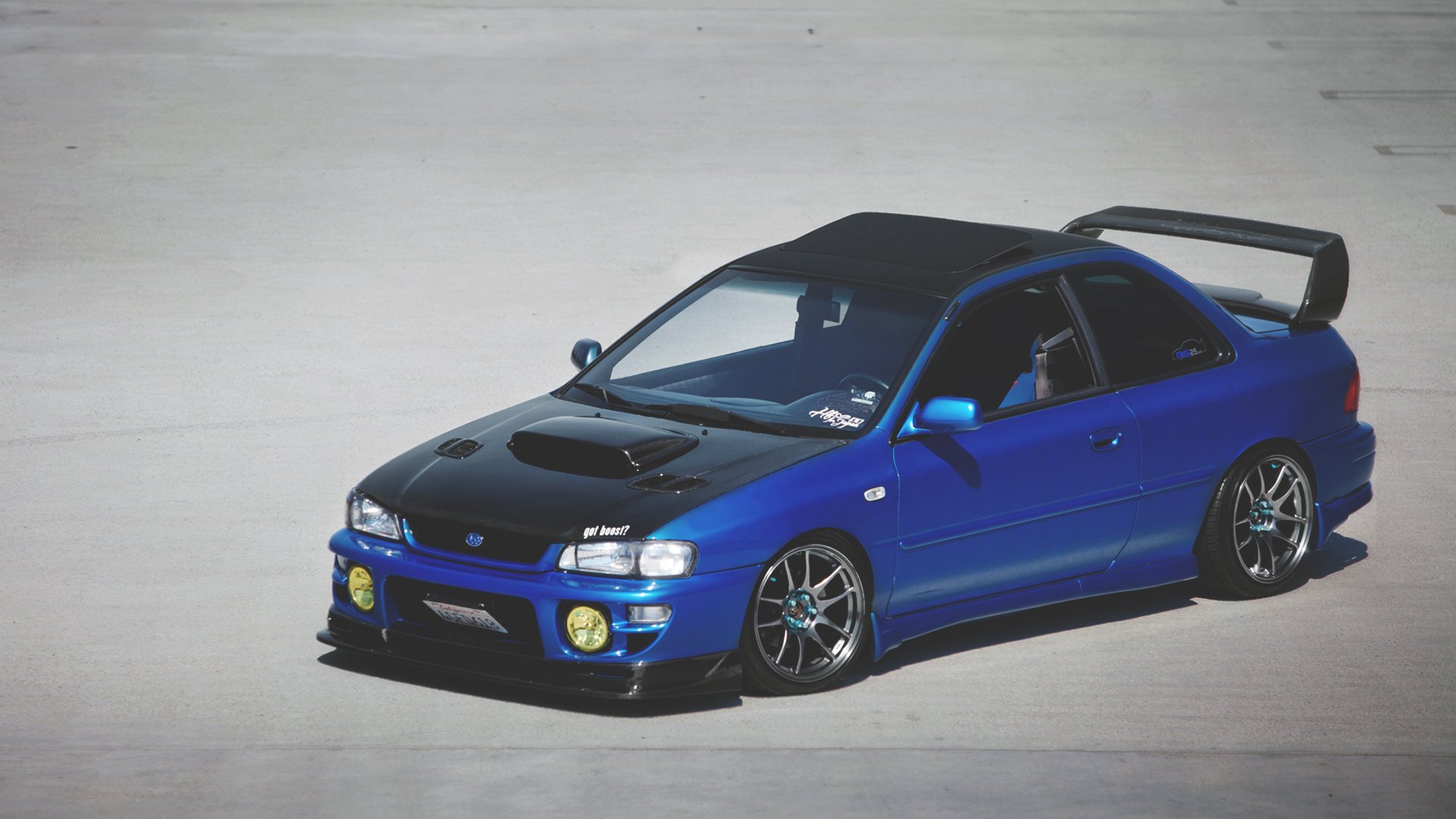 Wallpaper with a white subaru wrx on a background of gray garagesWallpaper with a white subaru wrx on a background of gray garages