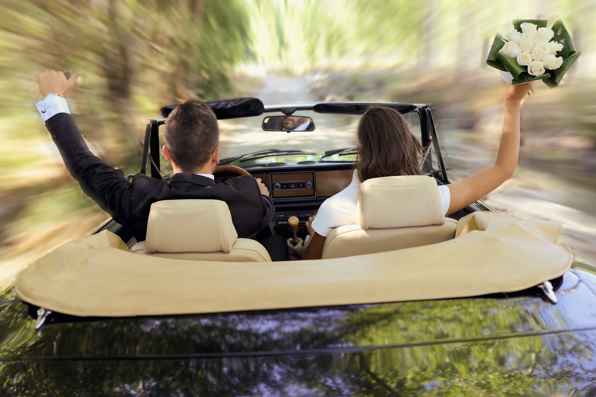 A guy in a suit and a girl with a bouquet are racing in a convertible