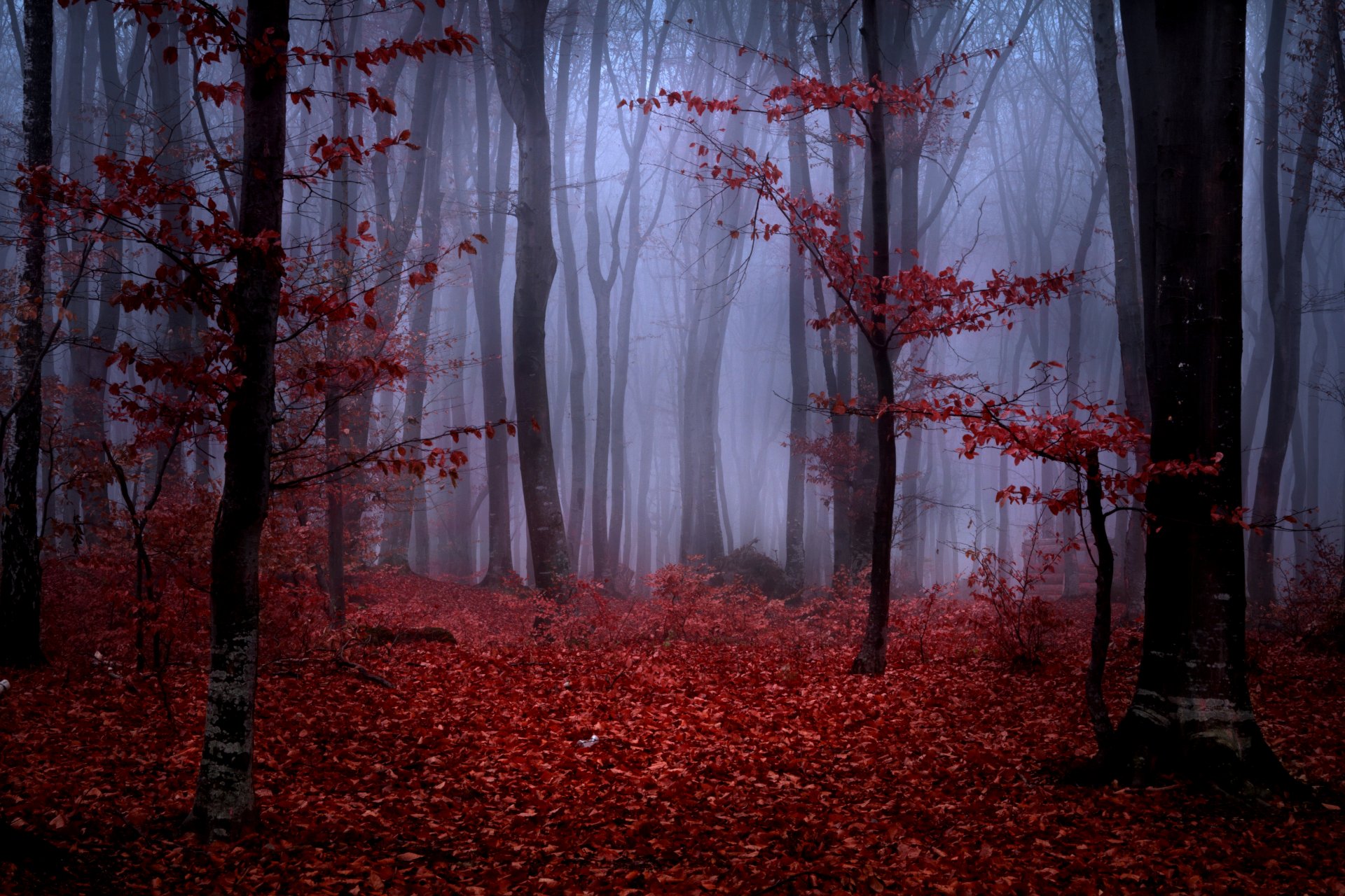 Fog in the autumn forest. Red leaves