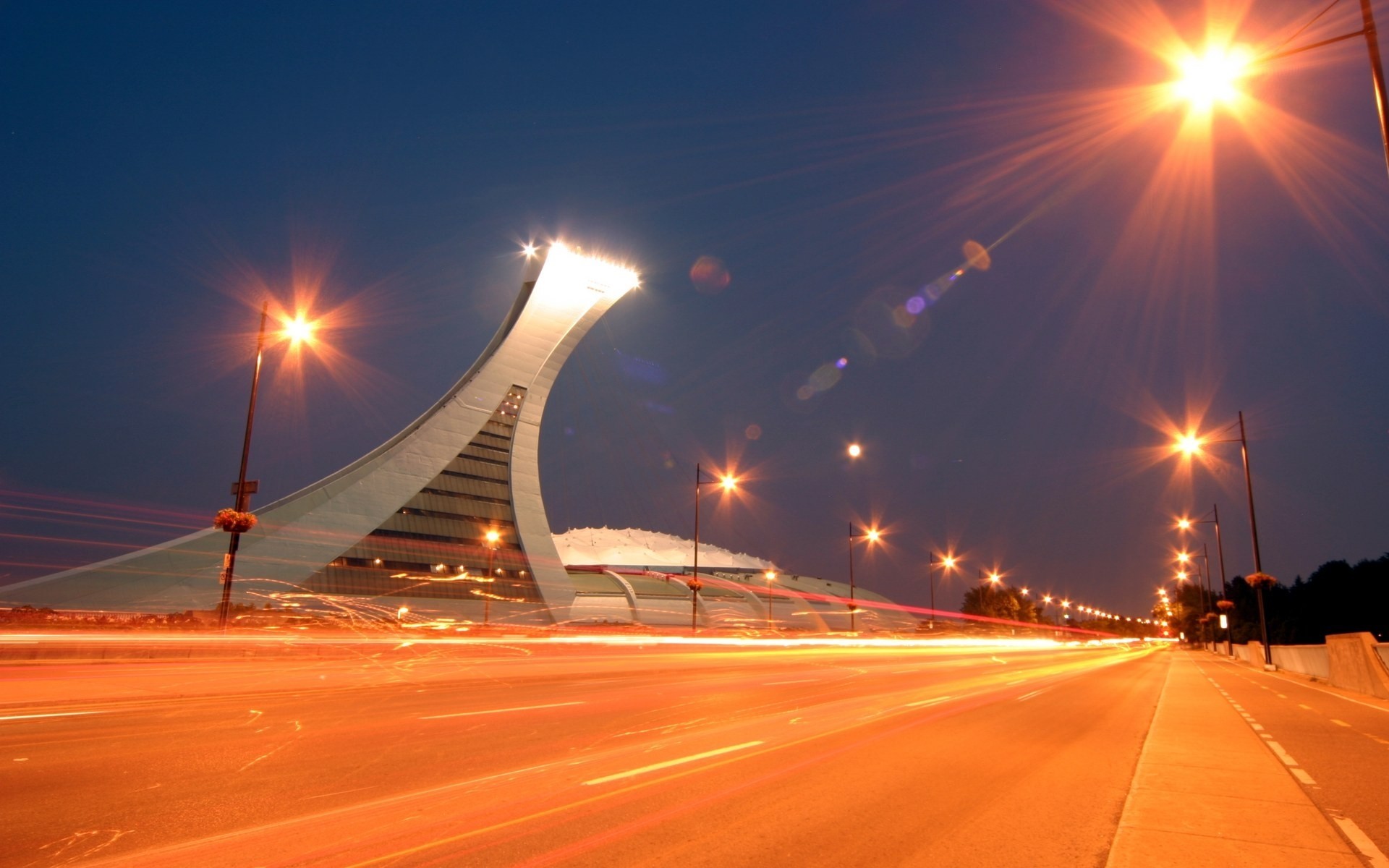 A red McLaren rushes across the bridge in the light of night lights. An expensive sports car is flying over a night bridge