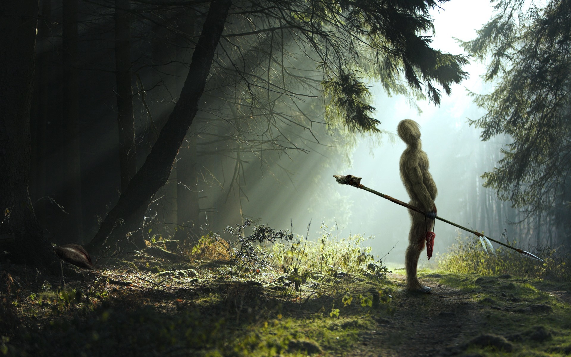 A hairy warrior with a spear in the forest