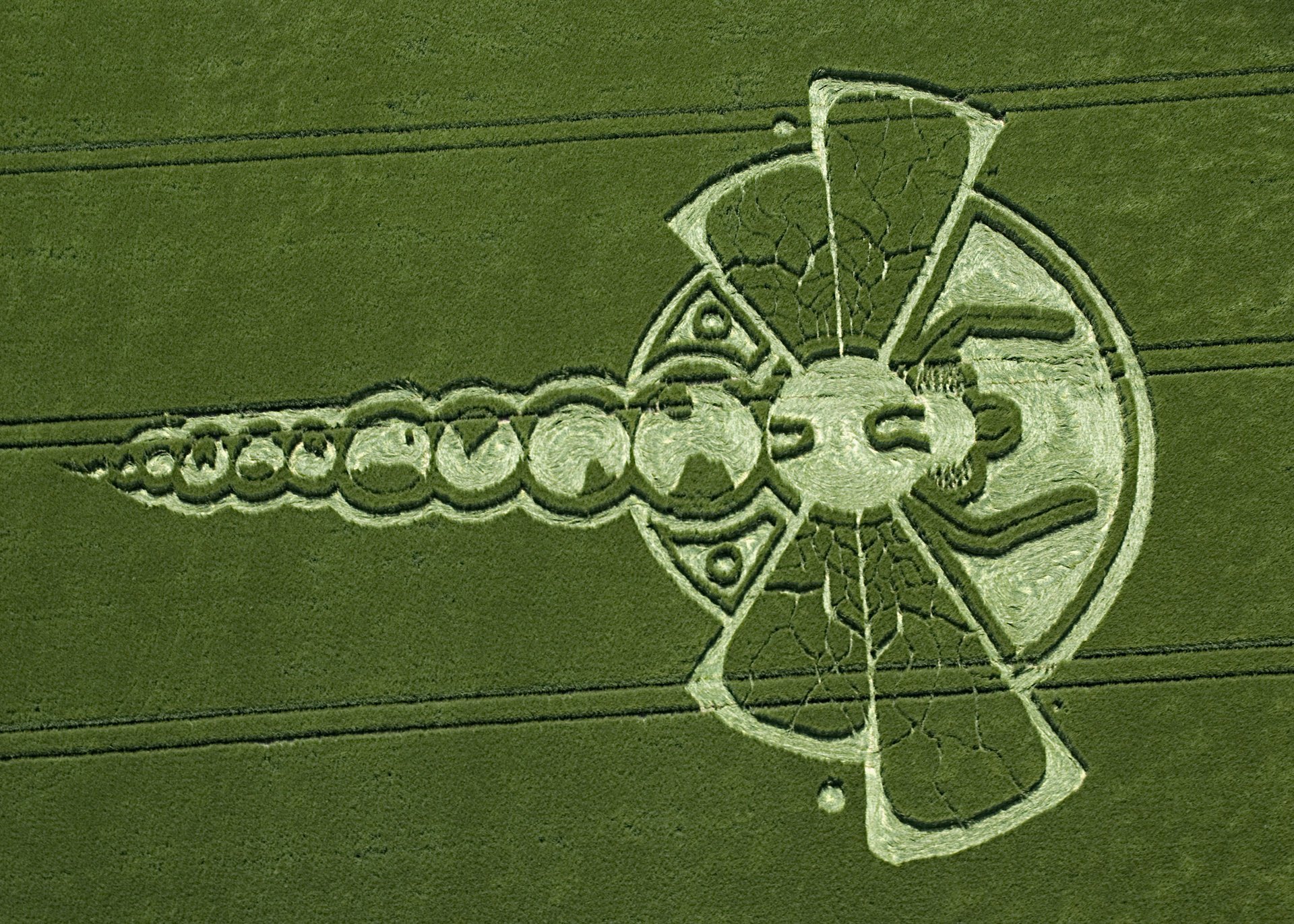 A circle on a green field in the form of a dragonfly