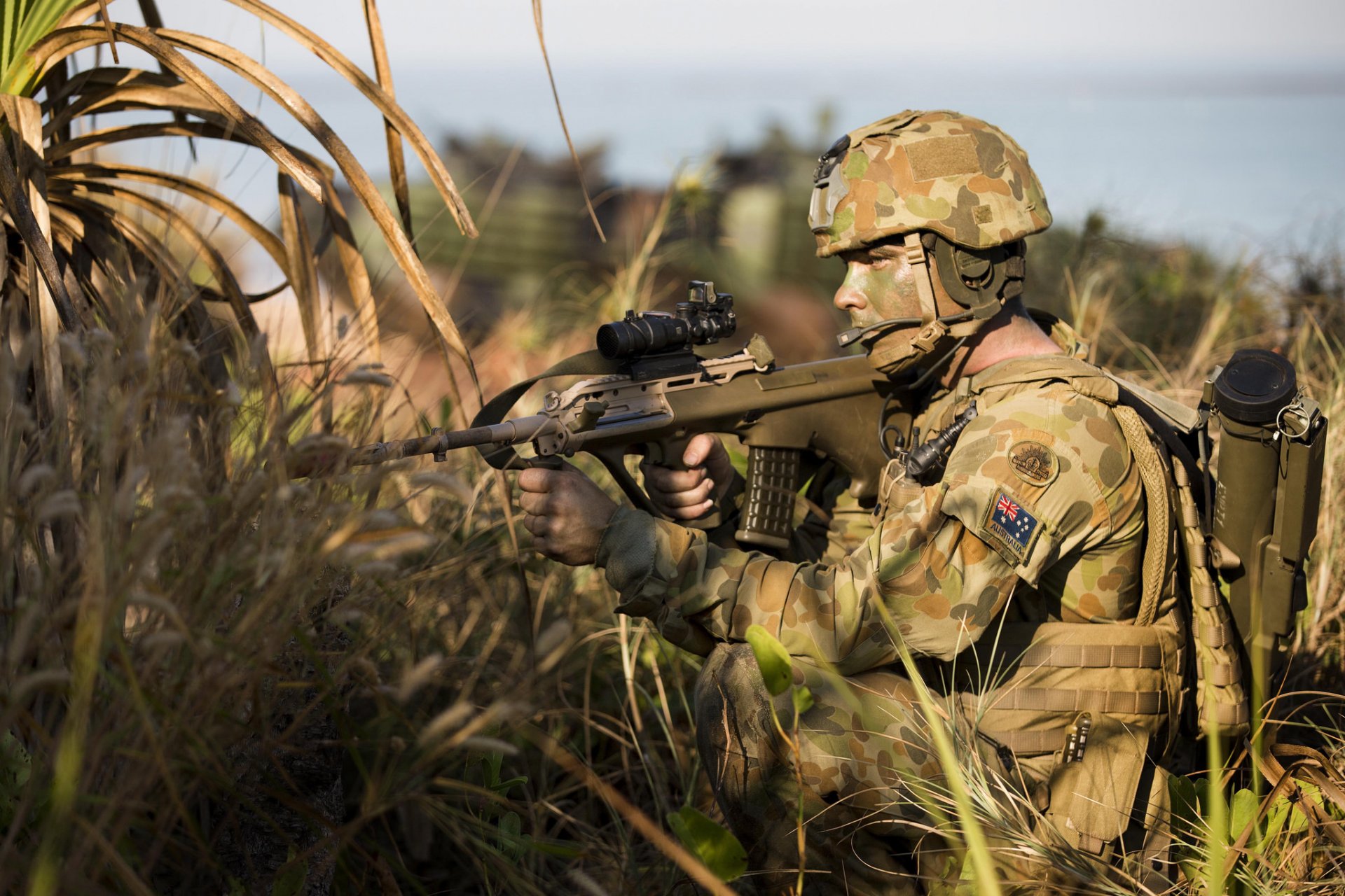 A soldier with a large weapon on his shoulder aimsA soldier with a large weapon on his shoulder aims