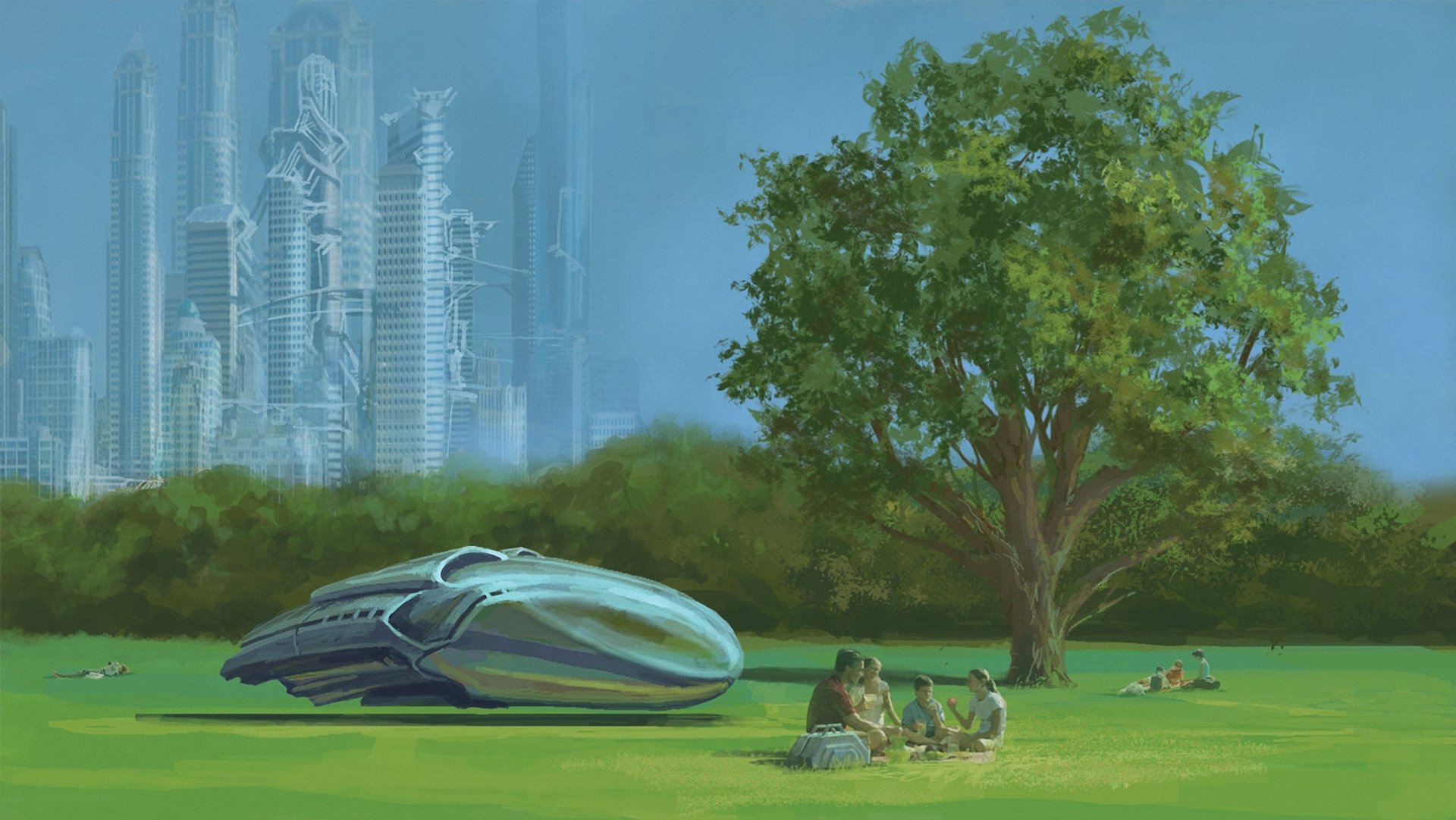 A distant utopia, where there are both parks and jet aircraft-carsA distant utopia, where there are both parks and jet aircraft-cars