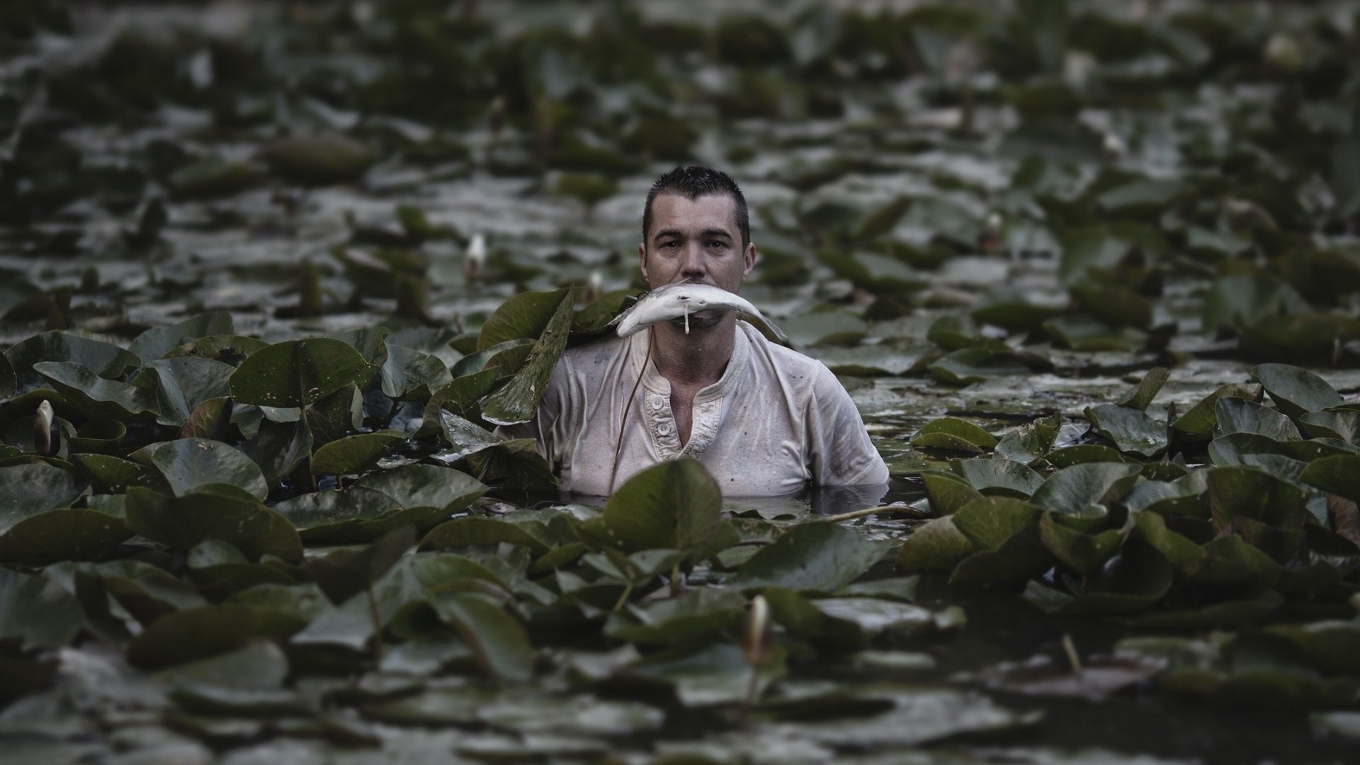 A guy with a fish in his mouth is standing in a pondA guy with a fish in his mouth is standing in a pond