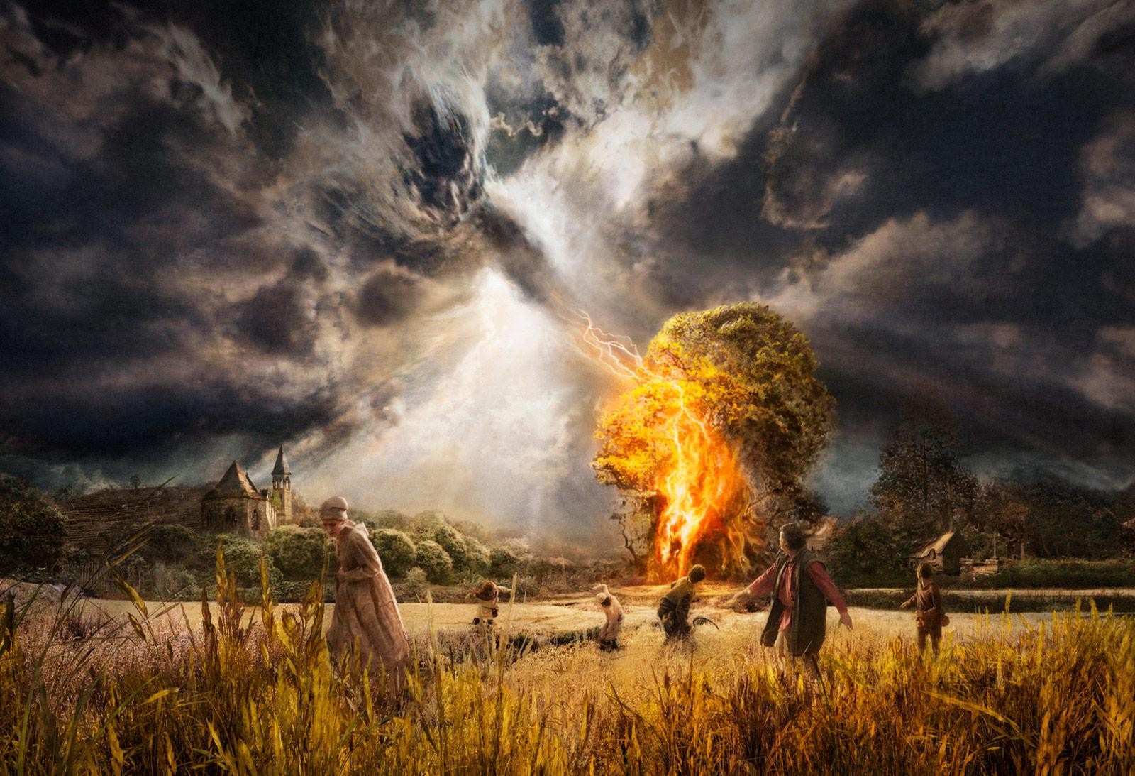 Divine lightning strike in the field on the background of the castleDivine lightning strike in the field on the background of the castle