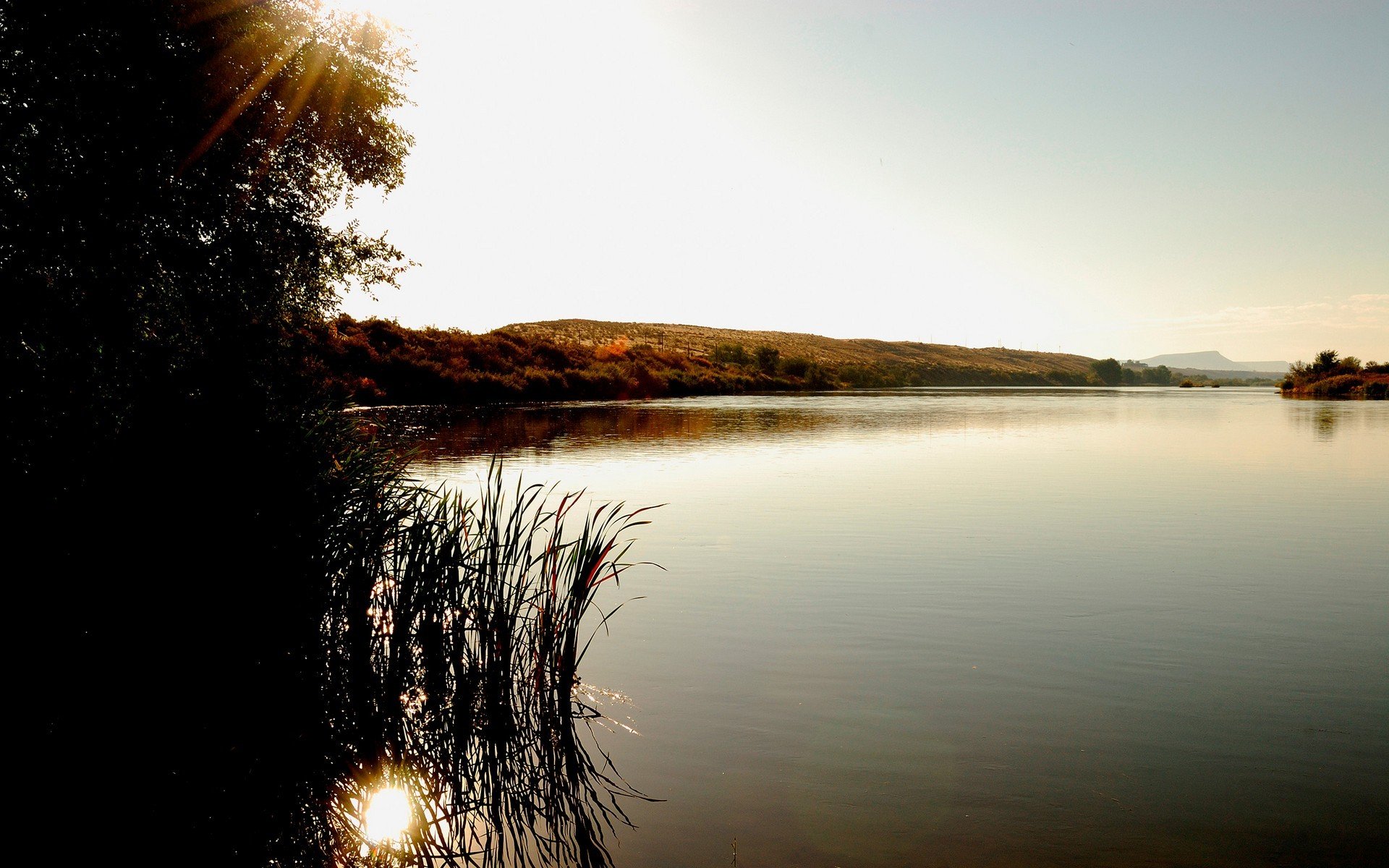 Landscape with a lake and two boats at sunset