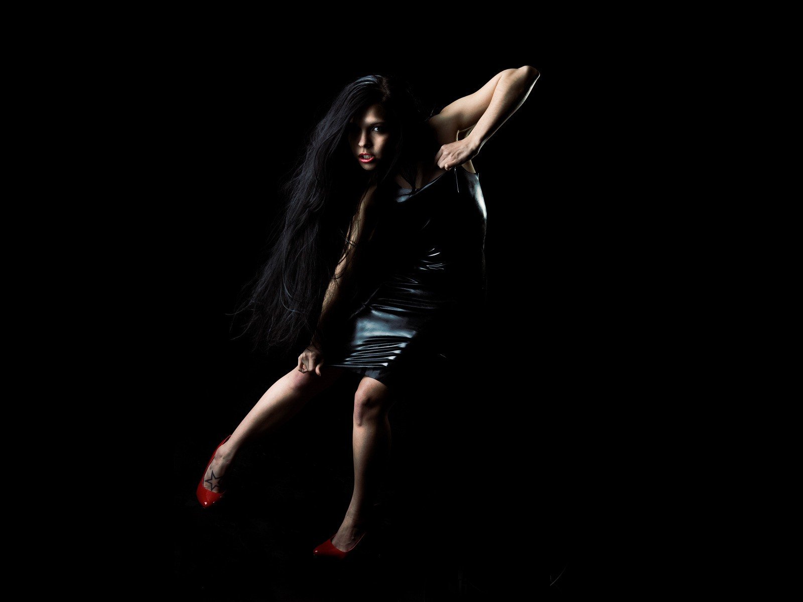 One girl is sitting on a leather sofa and shows her figureOne girl is sitting on a leather sofa and shows her figure