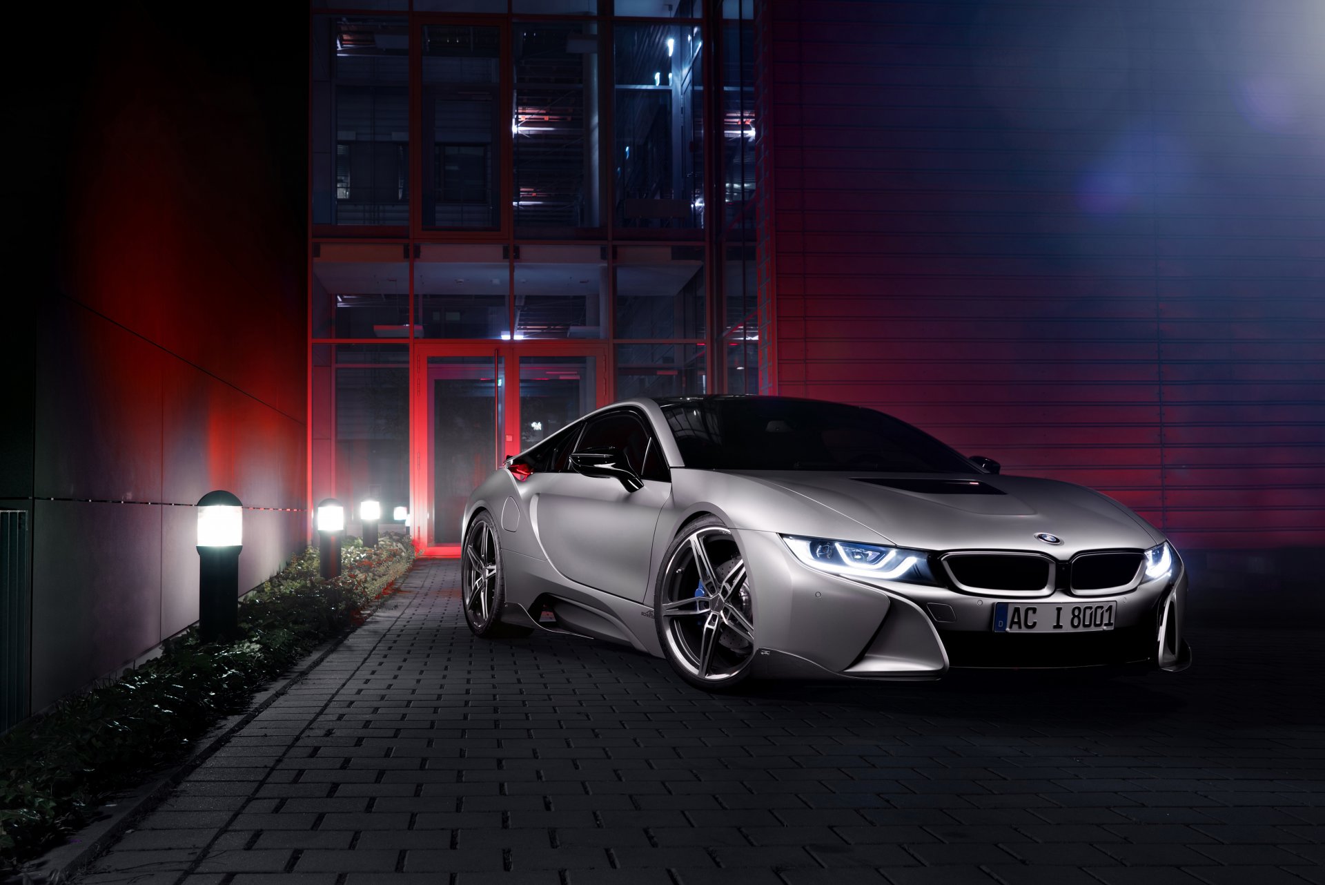 Bmw i8 in grey on the background of a building with red backlightBMW i8 in grey on the background of a building with red backlight