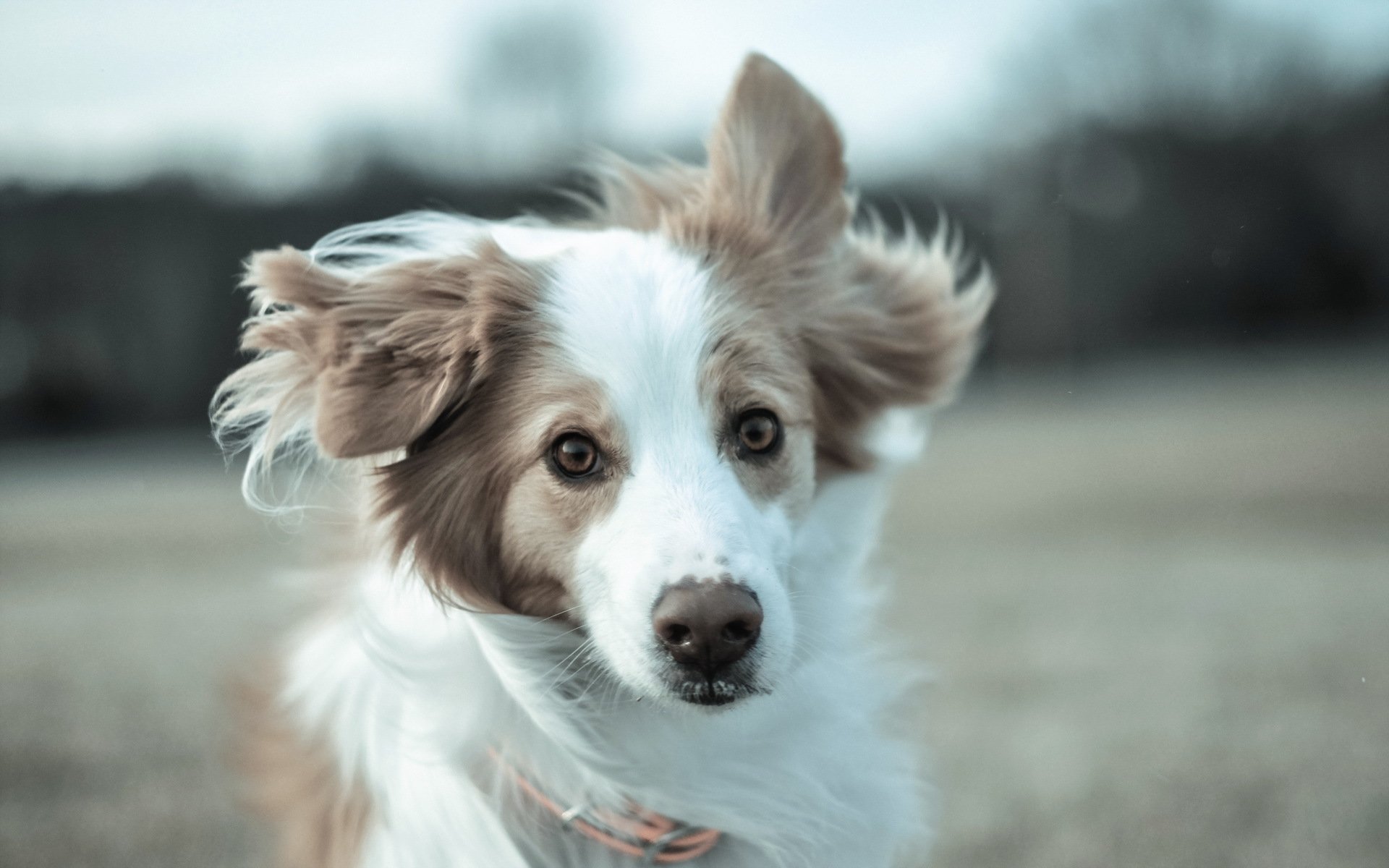 The dog looks at the owner, holding a ball in his teethThe dog looks at the owner, holding a ball in his teeth