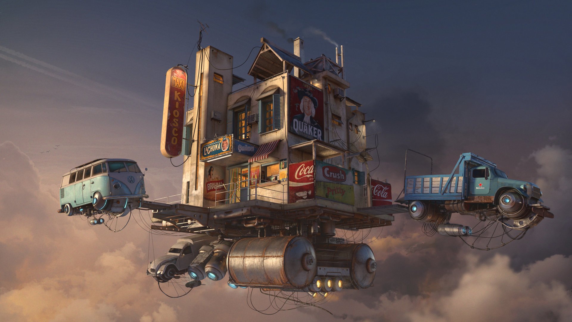Post-apocalyptic art with people around a large walking tank and gruzvikiPost-apocalyptic art with people around a large walking tank and gruzviki