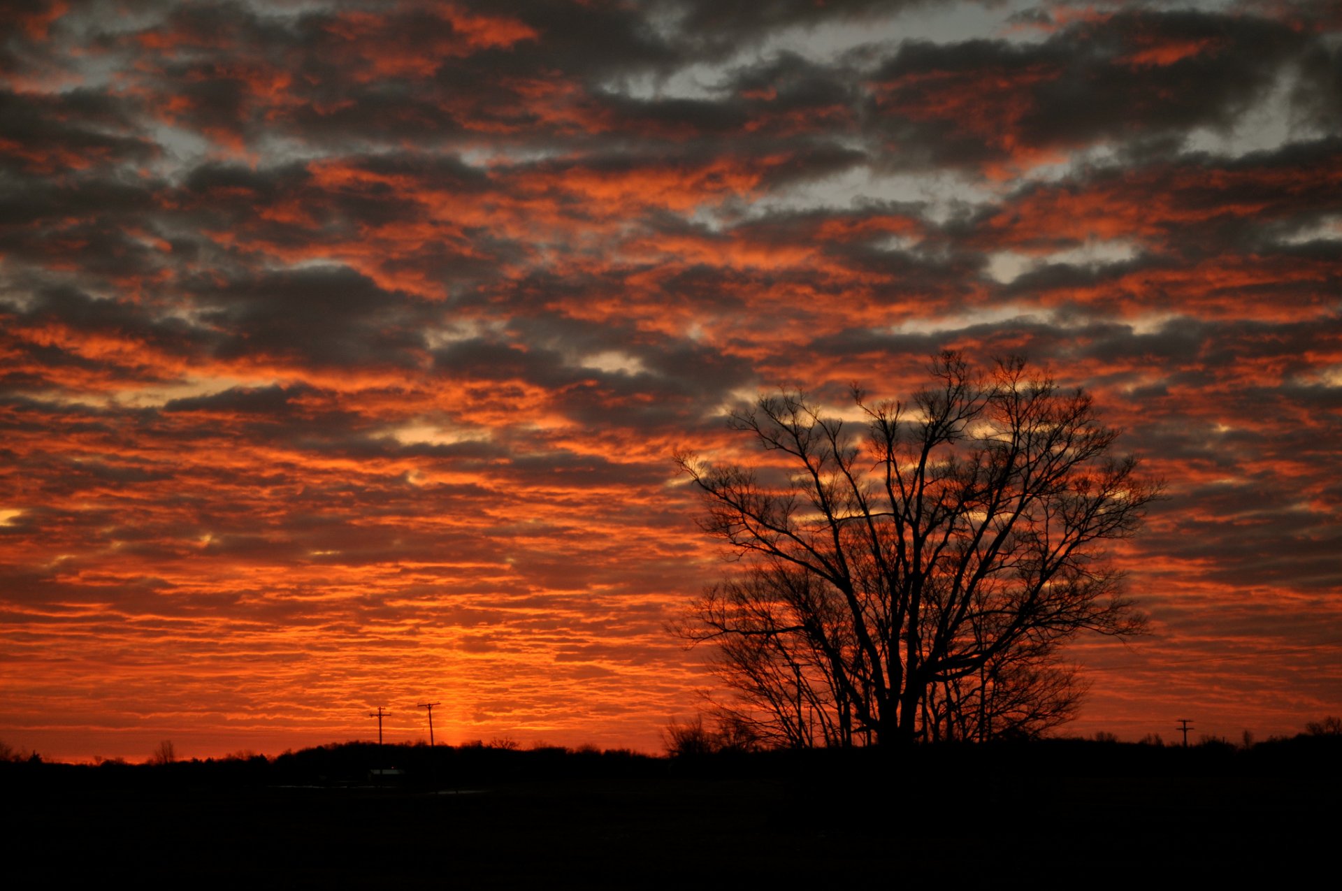 Silhouette of a tree and grass against a red sunset