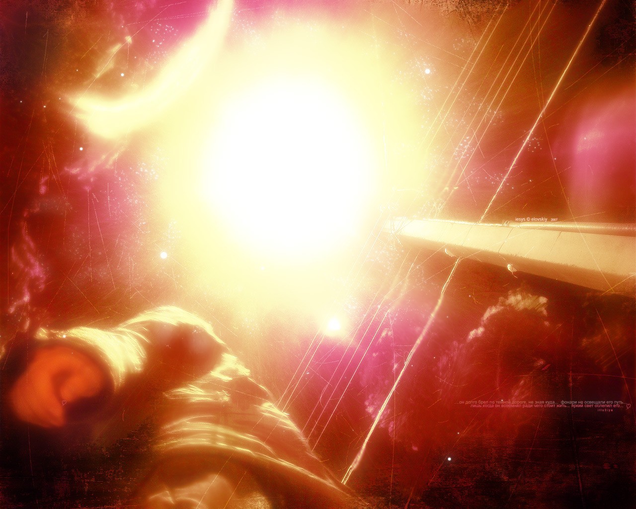 A dark image of a man with an umbrella, a bright ray of light in the dark