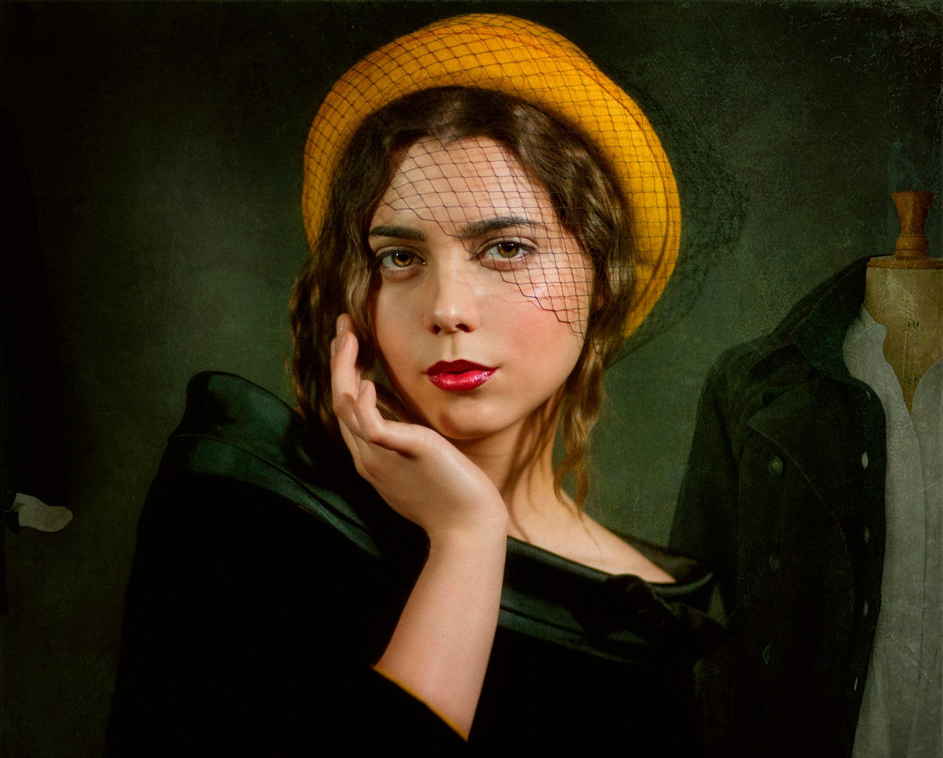 Brunette in a theatrical mask on a black background