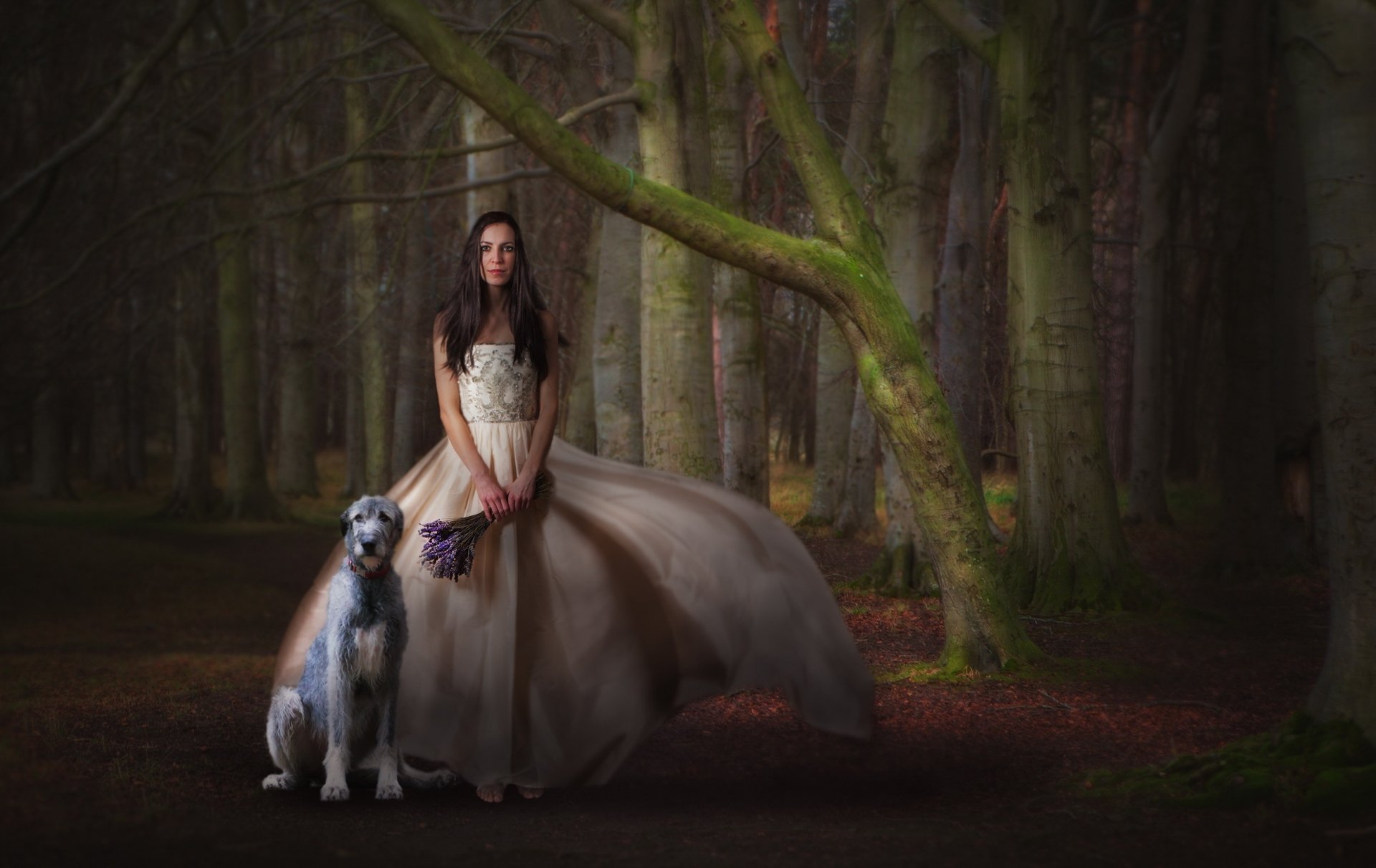 A girl in a beautiful dress with a bouquet of flowers and a dogA girl in a beautiful dress with a bouquet of flowers and a dog