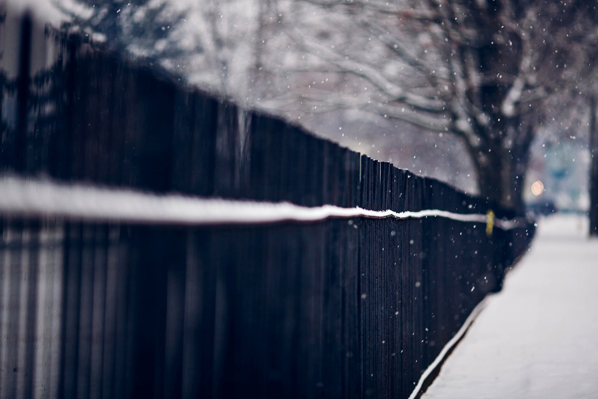 A long black fence along a snowy road