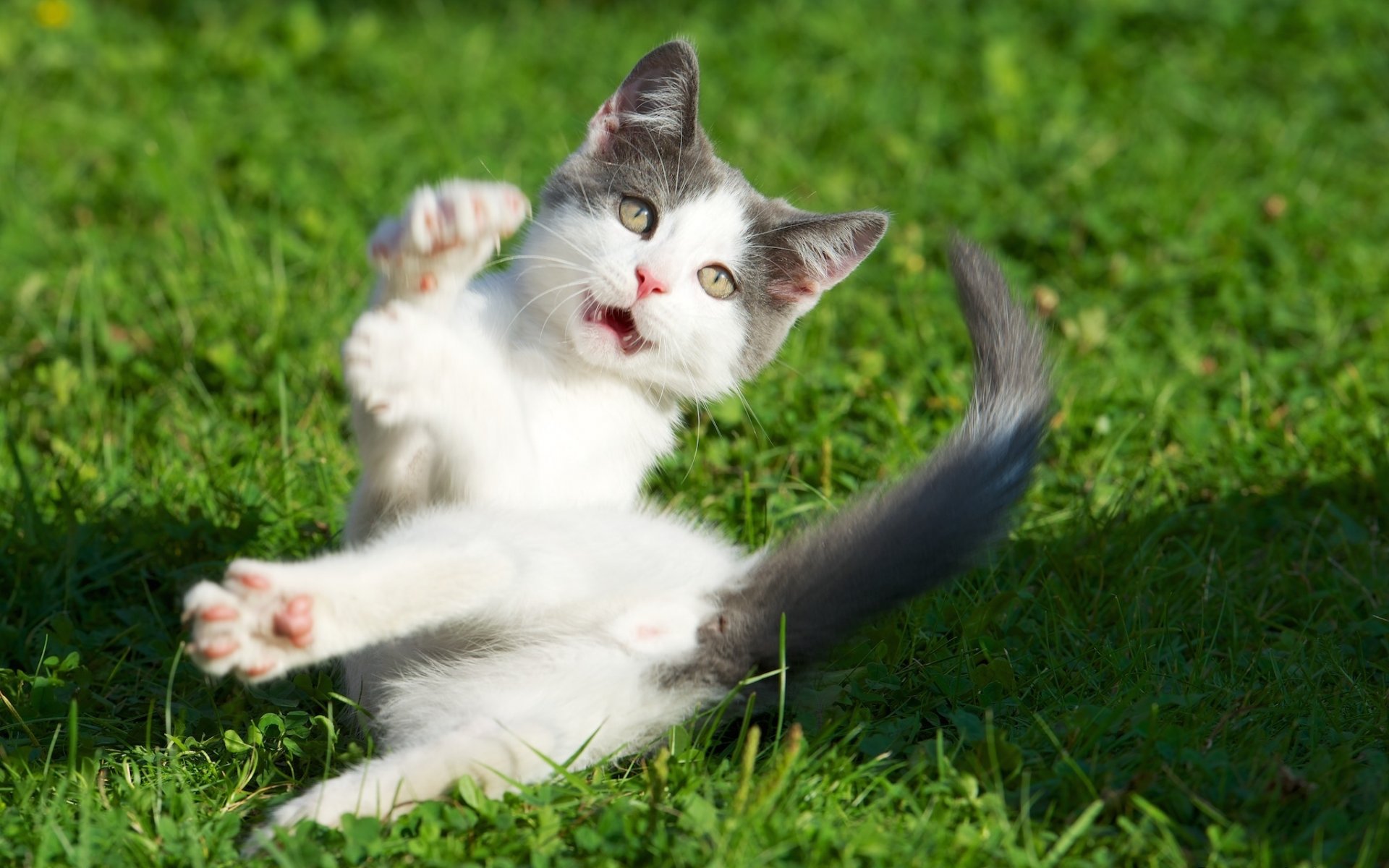 A scared cat on the green grass