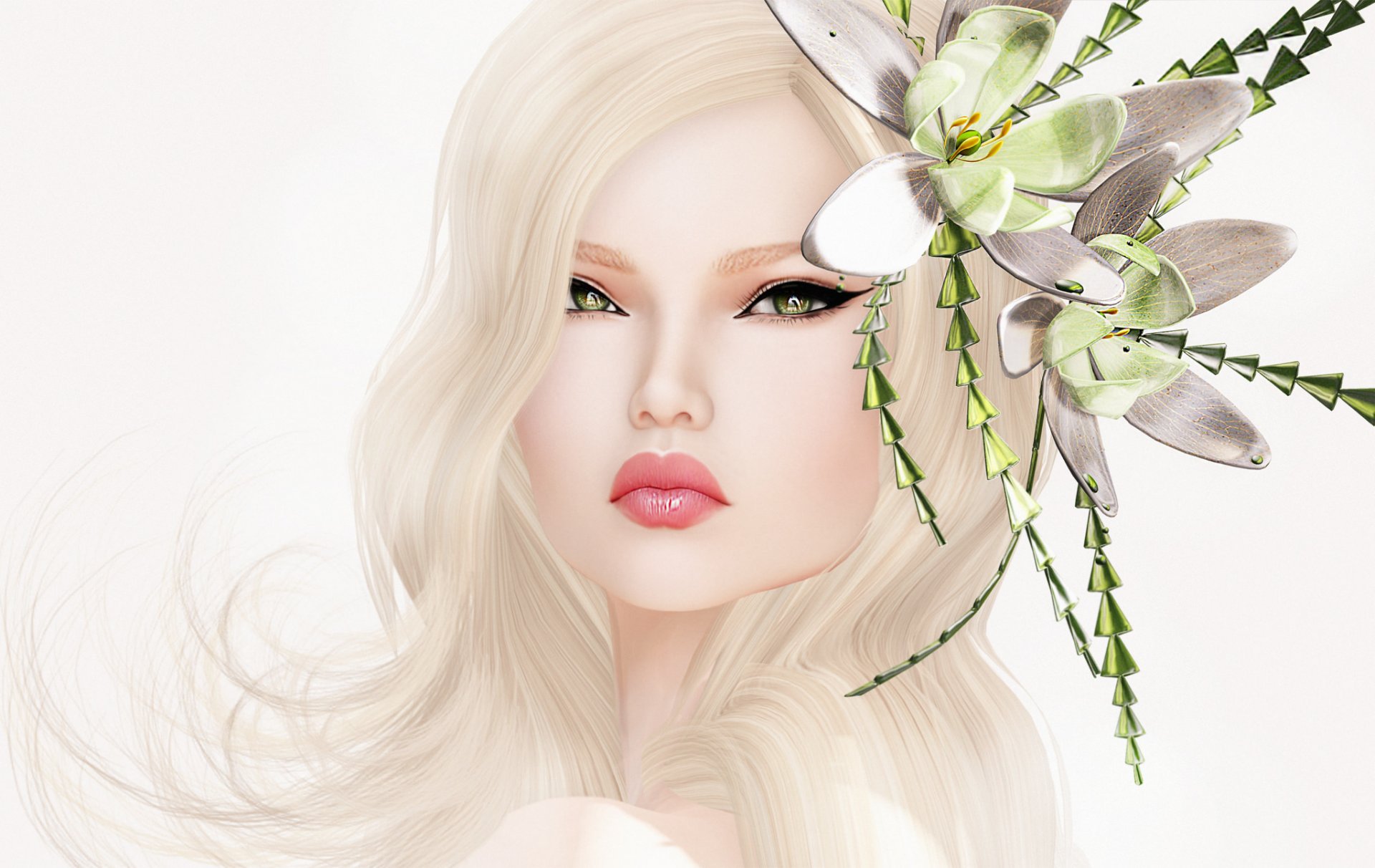 Image of a girl on a white background with a flower in her hairImage of a girl on a white background with a flower in her hair