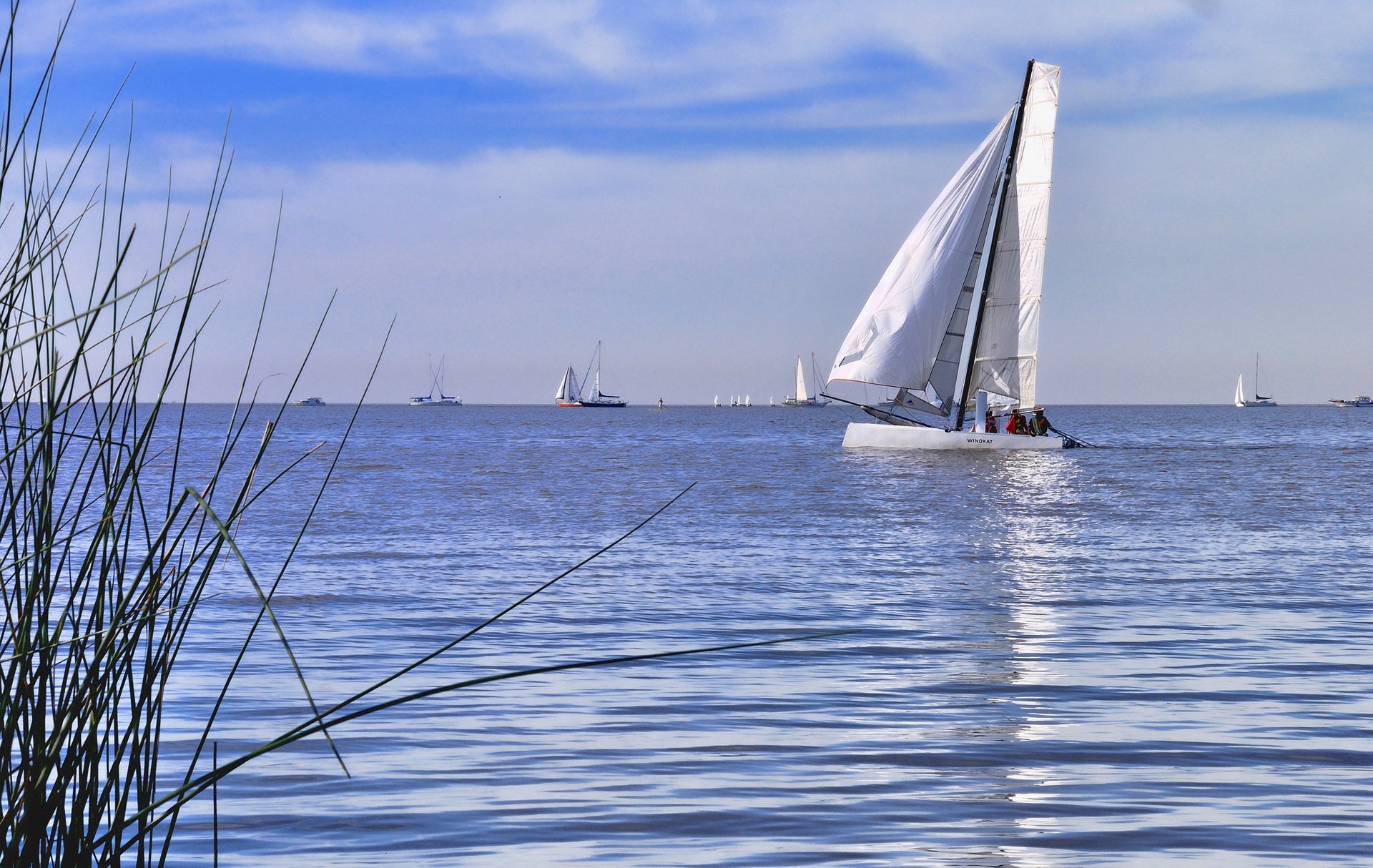 A small sailboat regatta sails on the sea