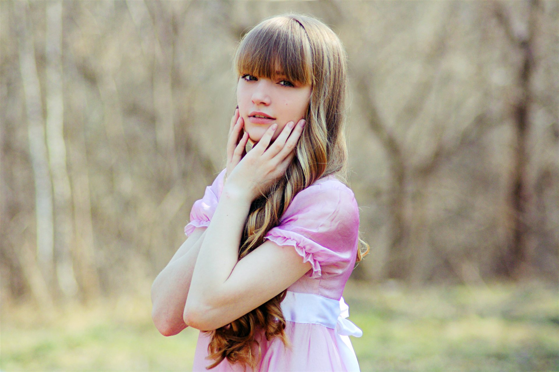 A girl in a pink dress in the middle of the forestA girl in a pink dress in the middle of the forest