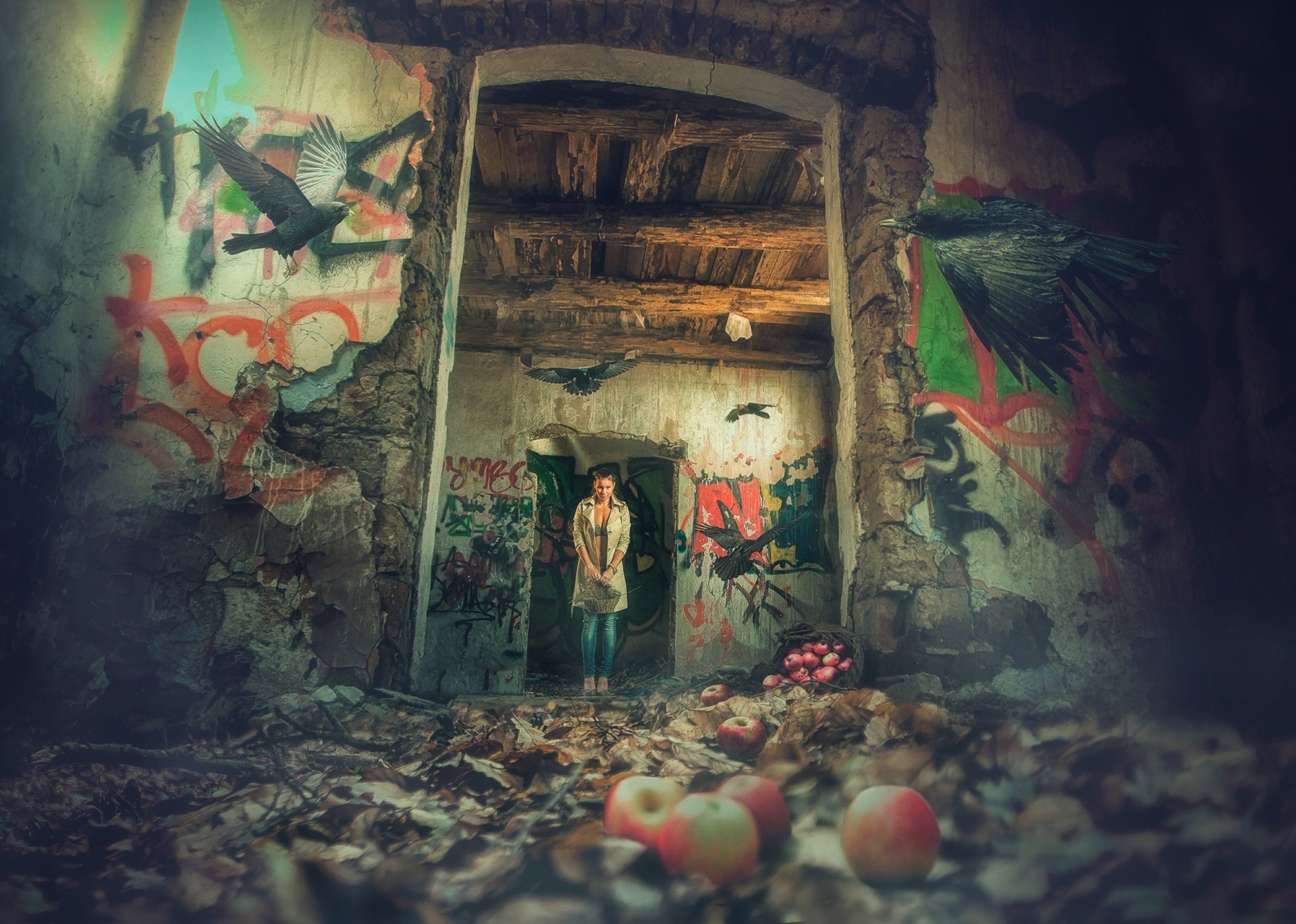 A girl on the threshold of an abandoned house, apples on the ground and black birds