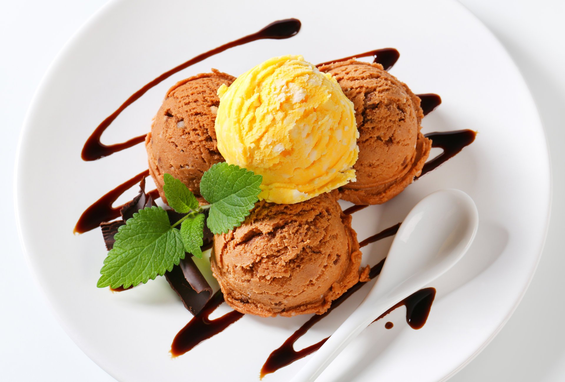 Dessert of chocolate and mango ice cream with mint on a plate