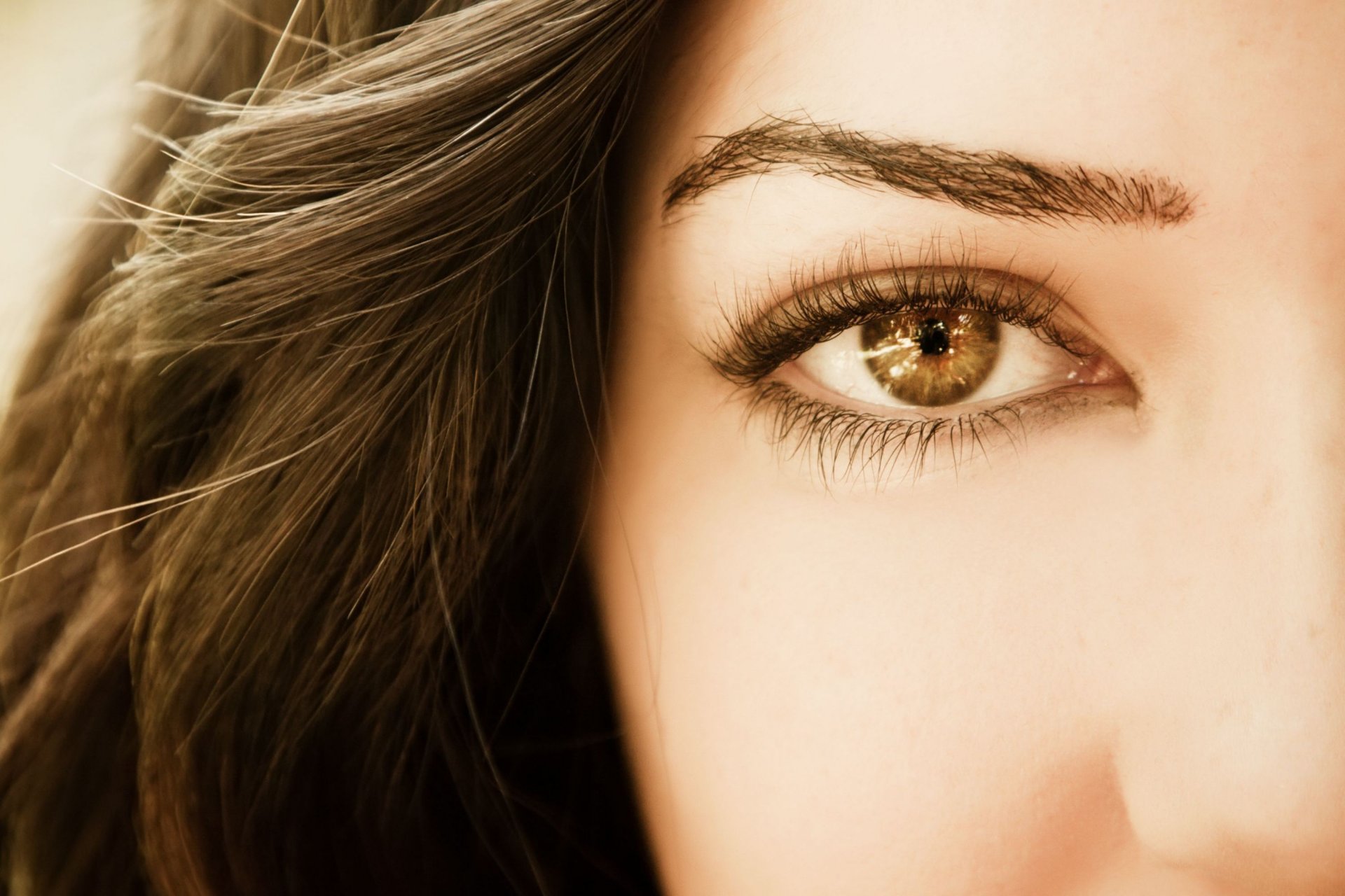 Brown eye of a girl with big eyelashes