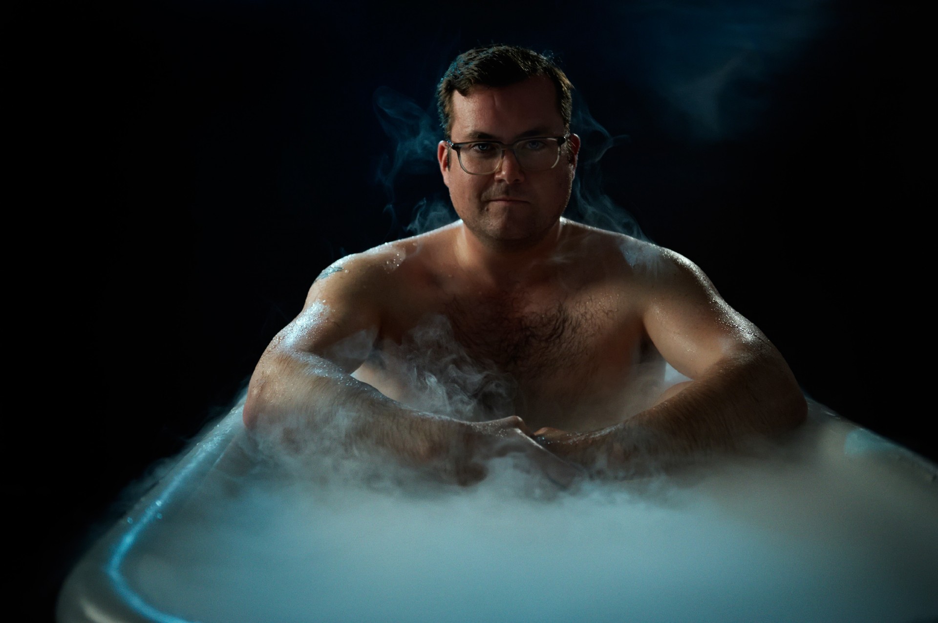 Photo of the actor sitting in the bathroom