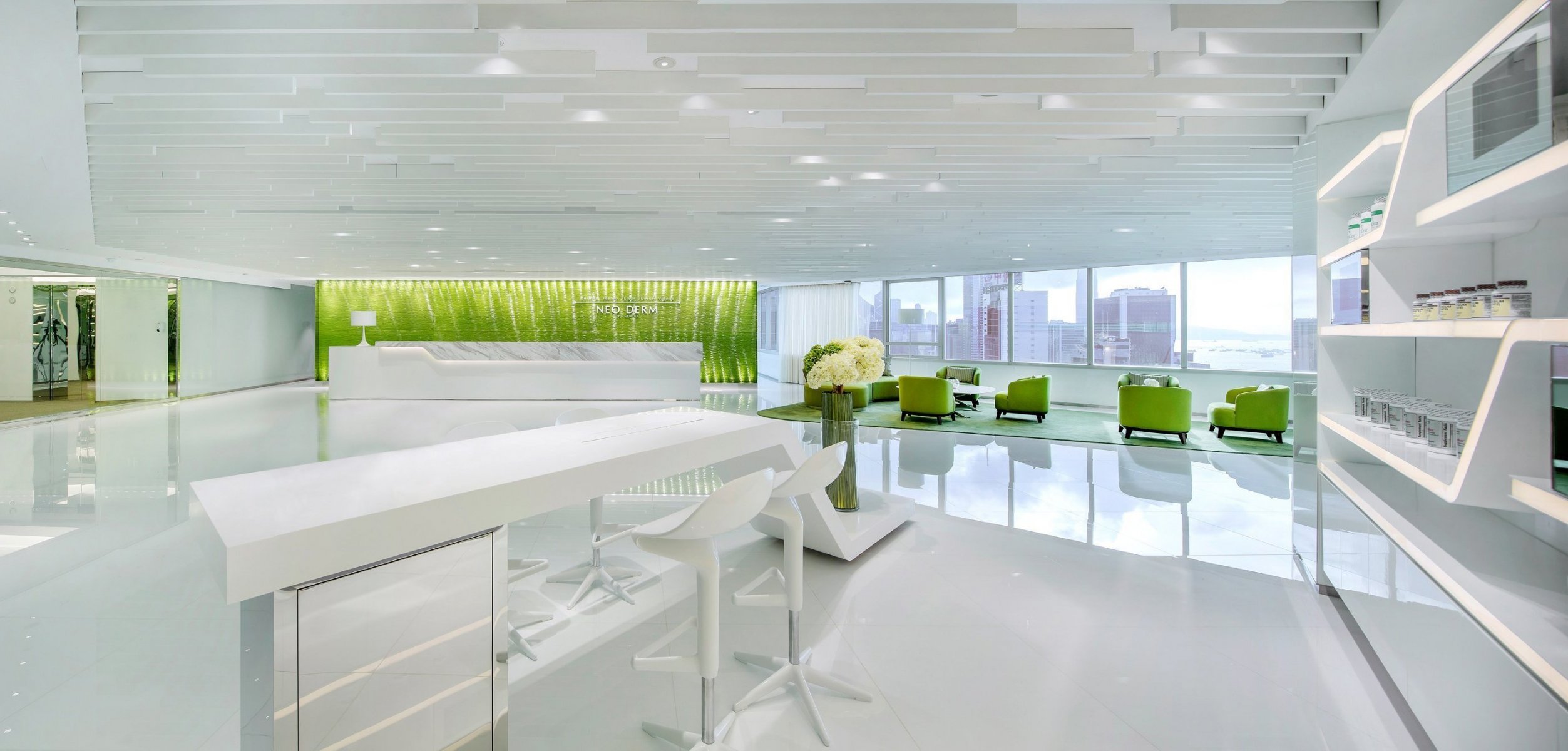 The interior of a modern living room with large windows