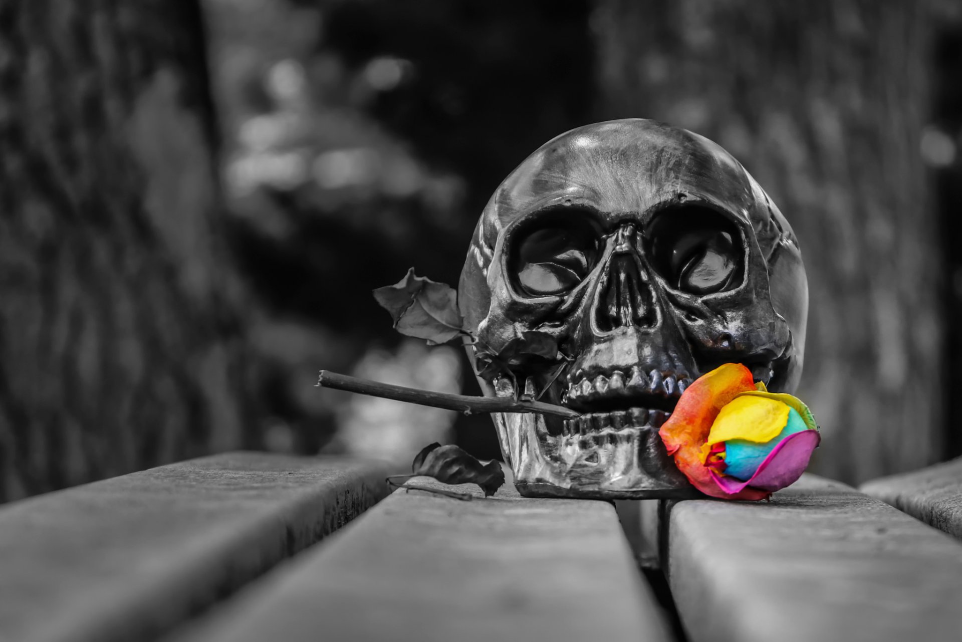 A black skull with a multicolored flower in its teethA black skull with a multicolored flower in its teeth