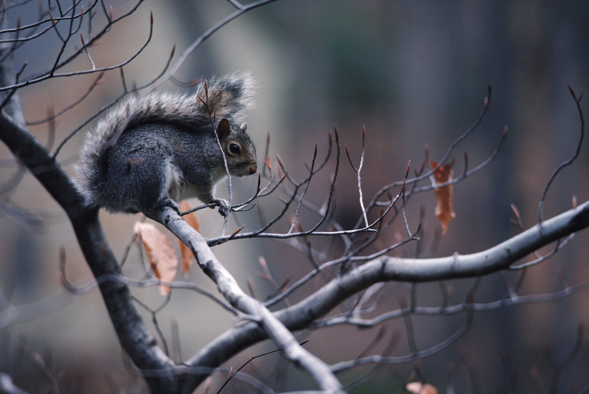 A gray squirrel lurked on a tree branch