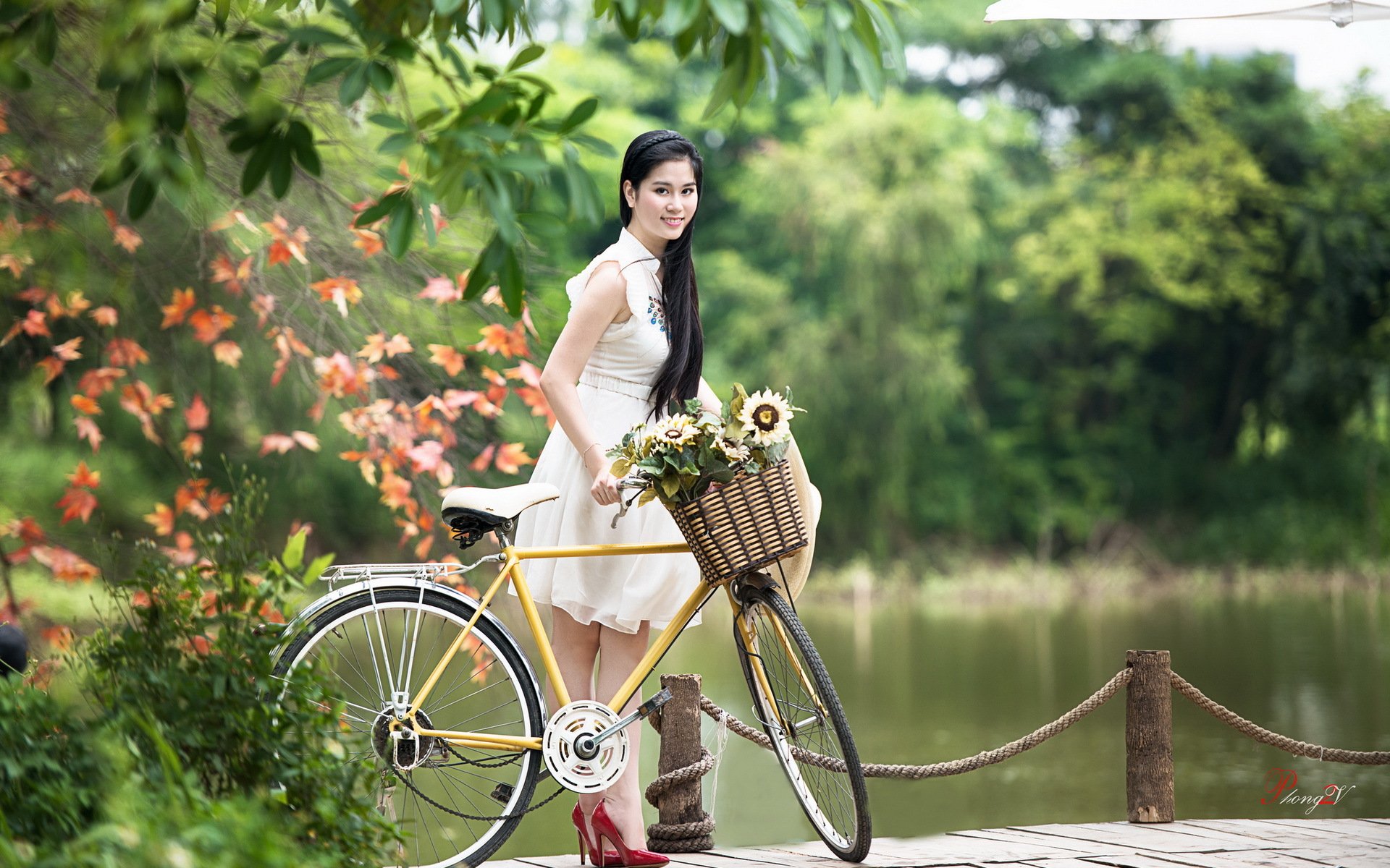A pretty asian woman is sitting on a wooden chair surrounded by wildlifeA pretty Asian woman is sitting on a wooden chair surrounded by wildlife