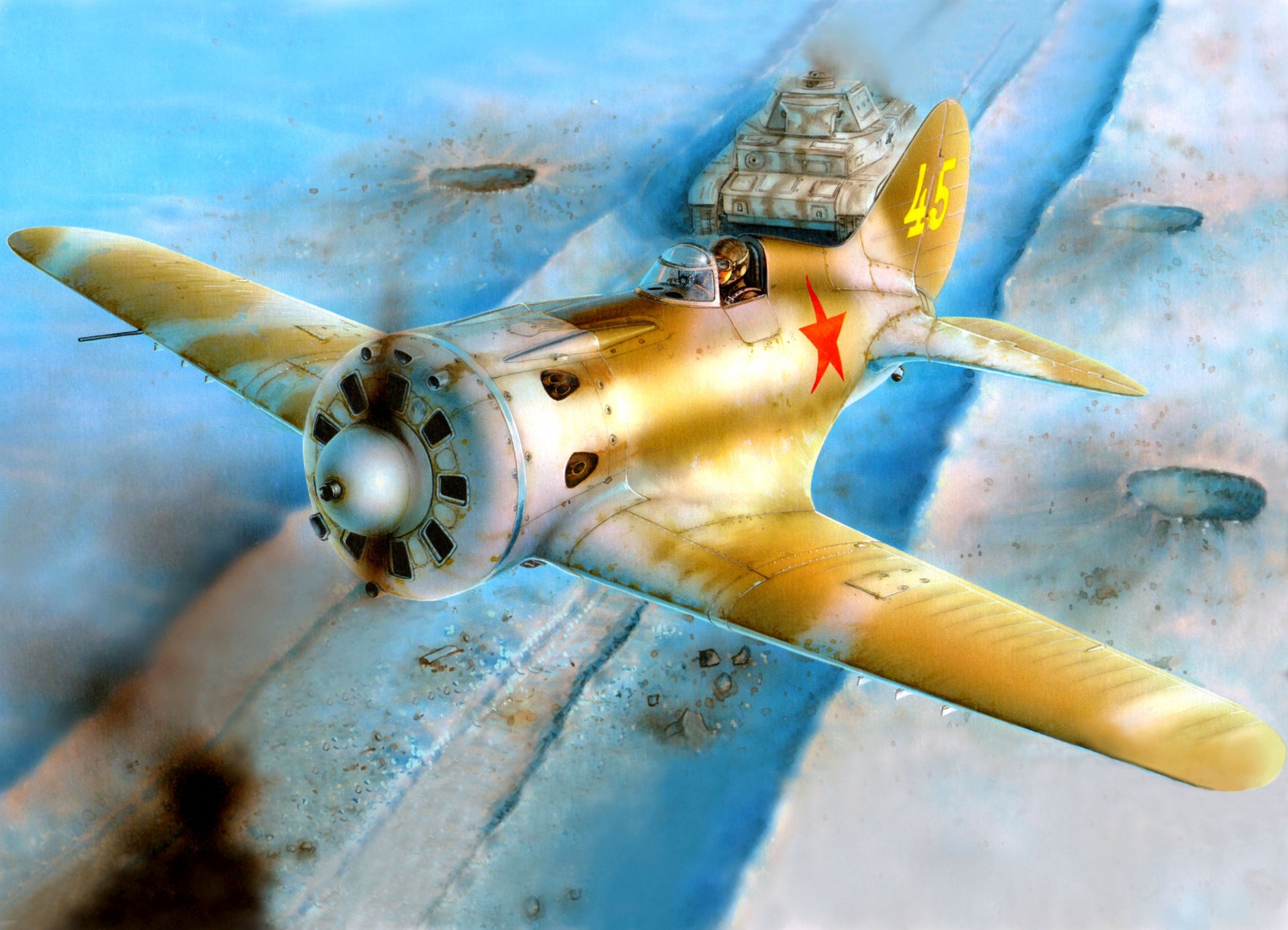A Soviet fighter jet is flying over the frontline road