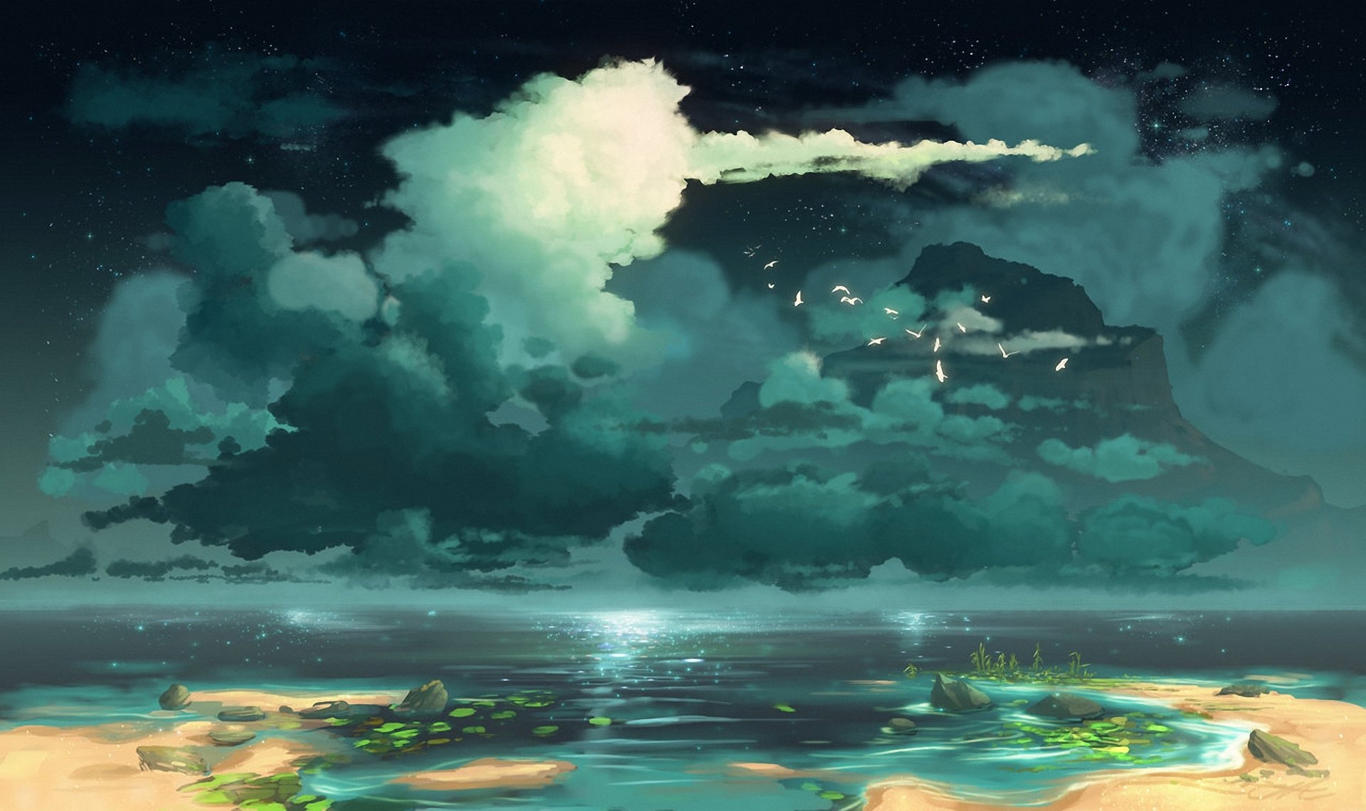 A landscape of mountains and a dark sky through which light breaks throughA landscape of mountains and a dark sky through which light breaks through