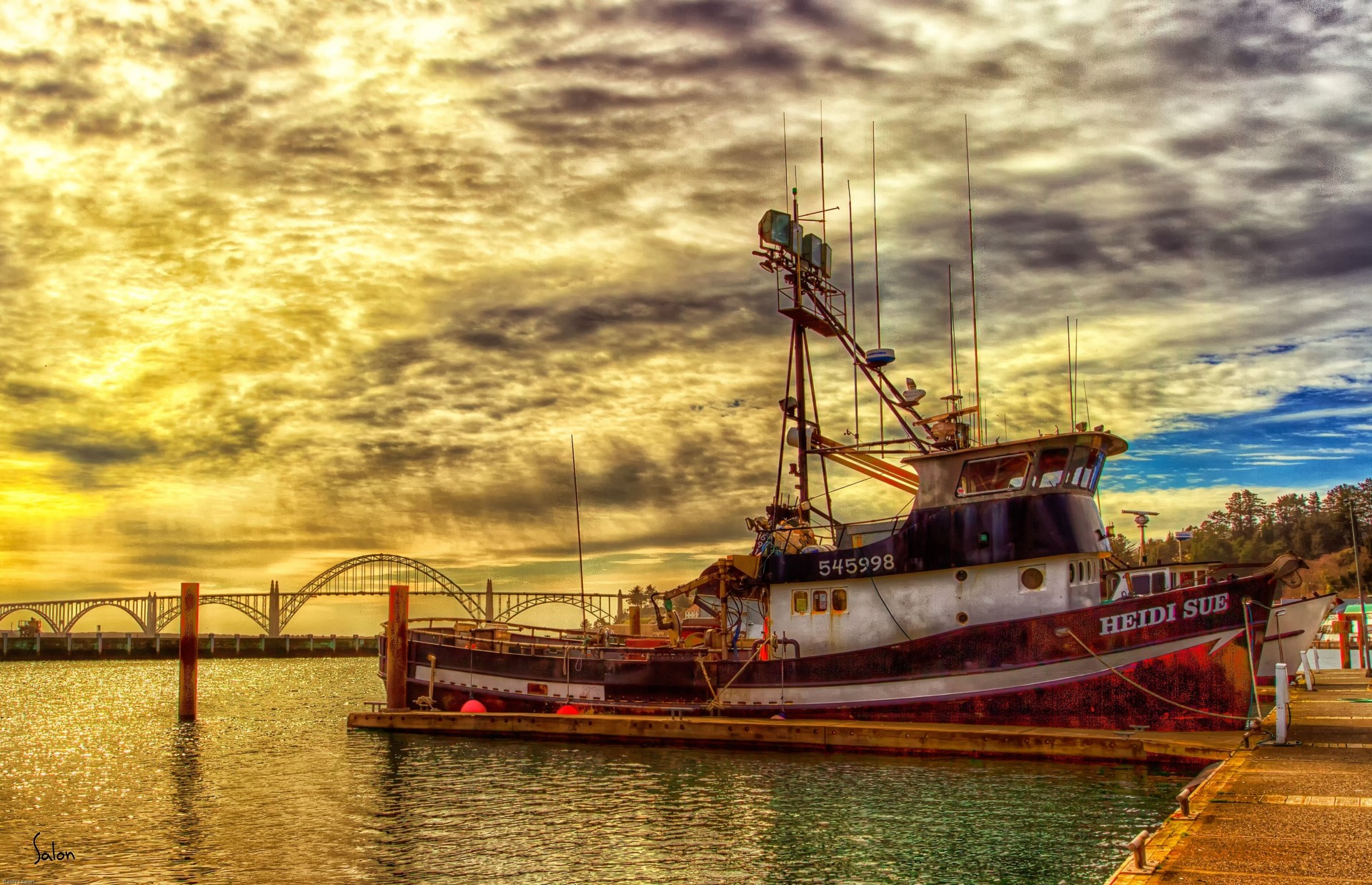 In the painting landscape a ship on a pier in the sunsetIn the painting landscape a ship on a pier in the sunset