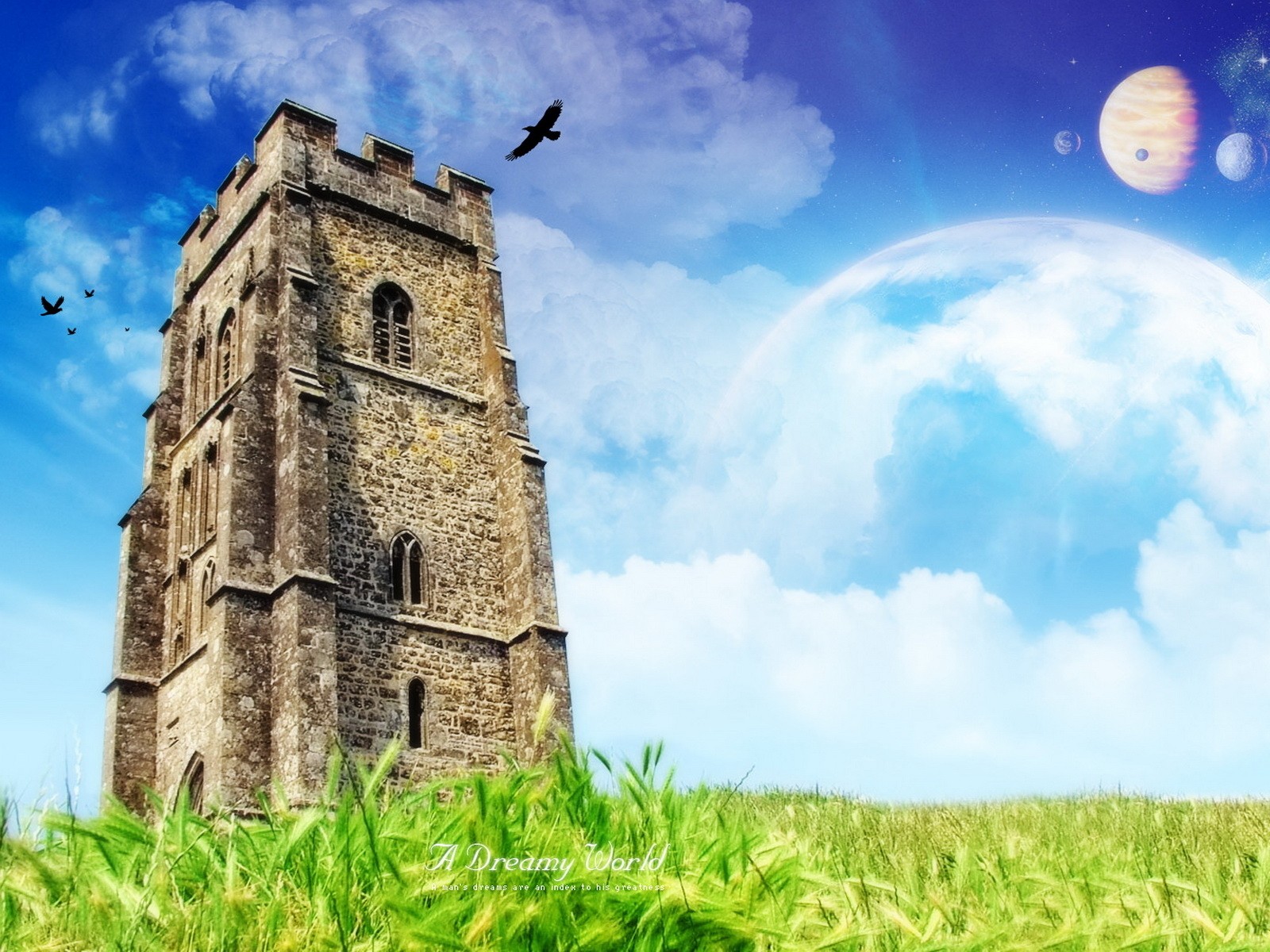 Planets in the sky and green grass