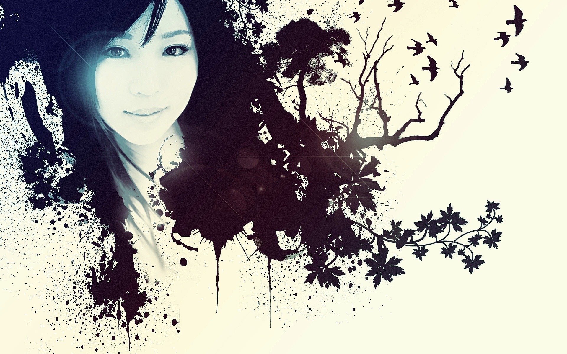 On a blue background, the child is the sun, the plants are an abstractionOn a blue background, the child is the sun, the plants are an abstraction
