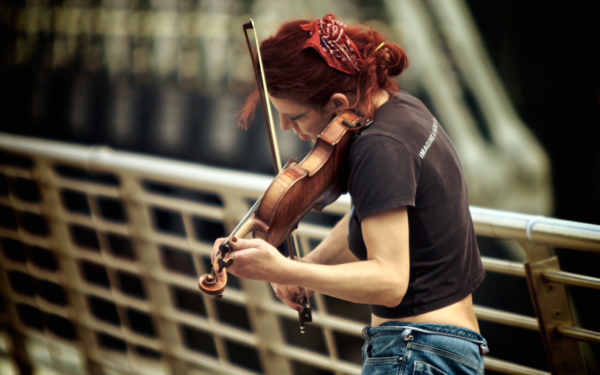 Red-haired girl plays the violin on the roof of the houseRed-haired girl plays the violin on the roof of the house