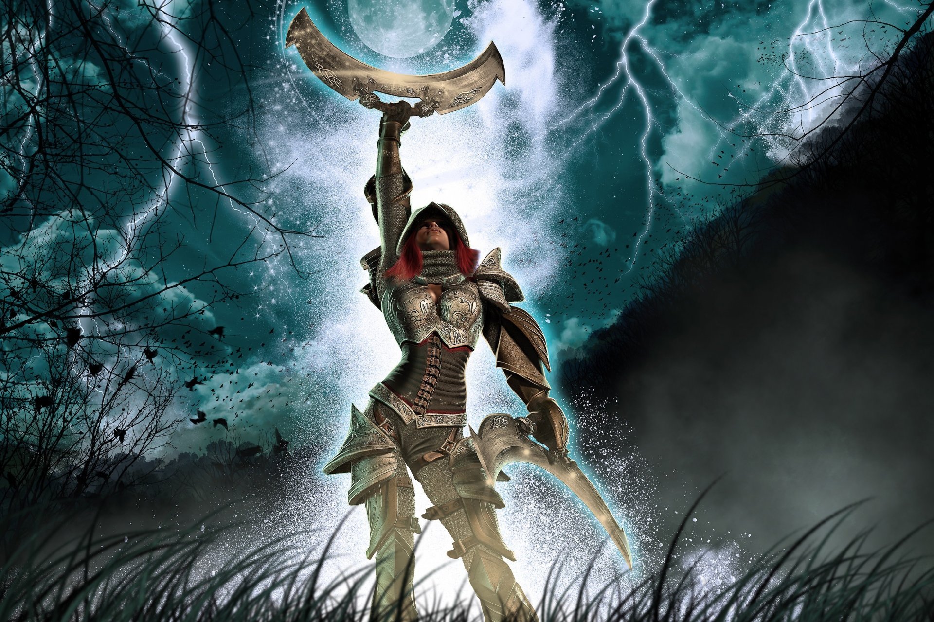 Archer girl on a griffin against the background of a thunderstormArcher girl on a griffin against the background of a thunderstorm