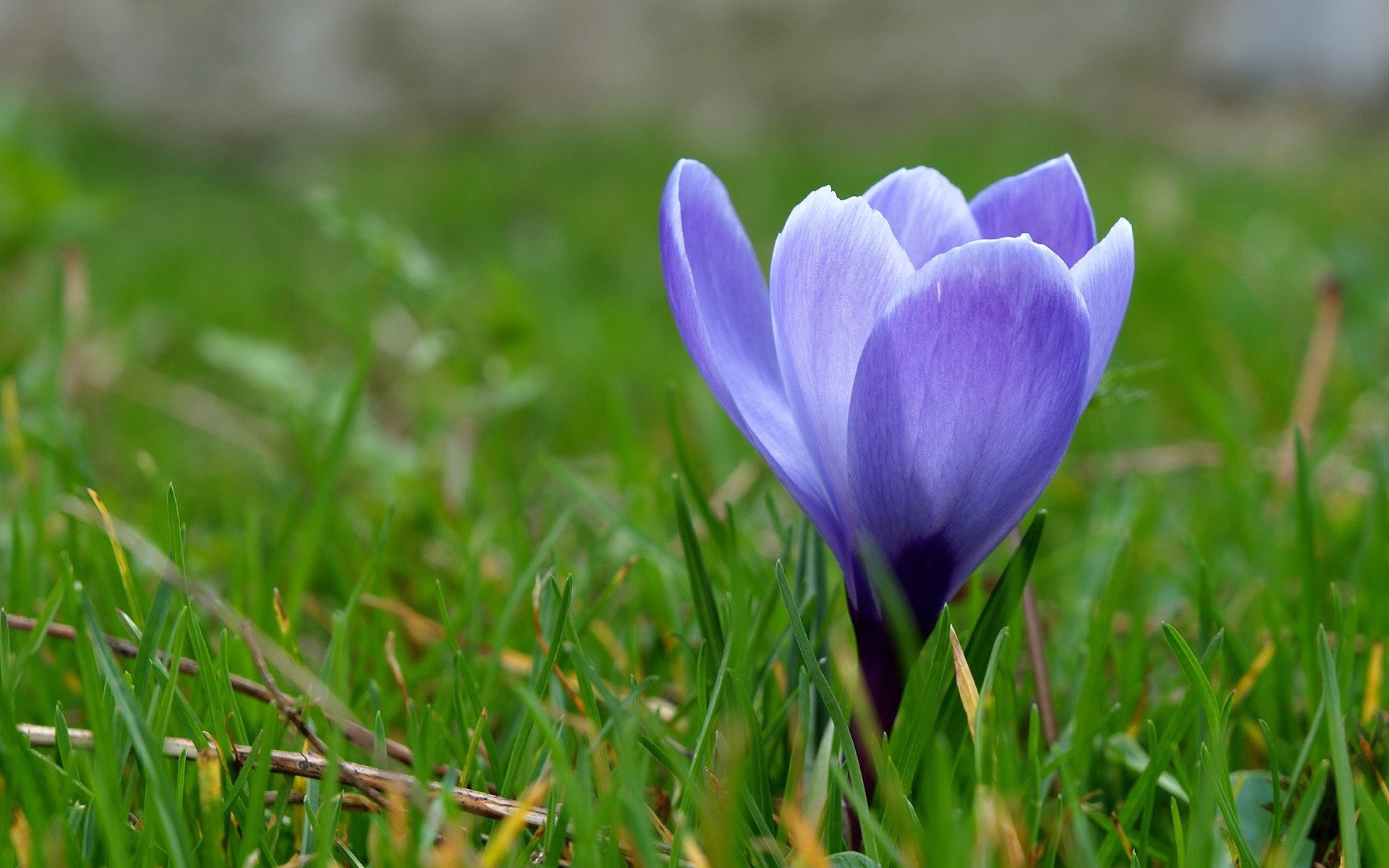 Purple crocuses in the grass , macro photography