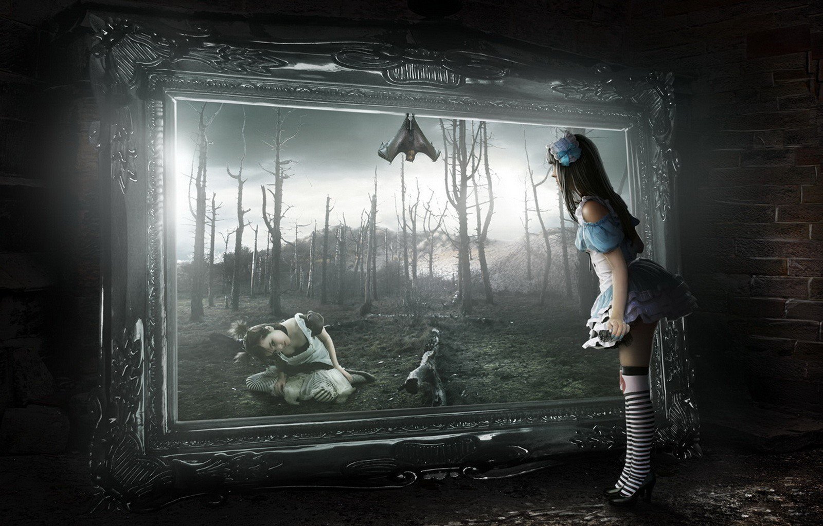 A girl in a skirt looks at a picture