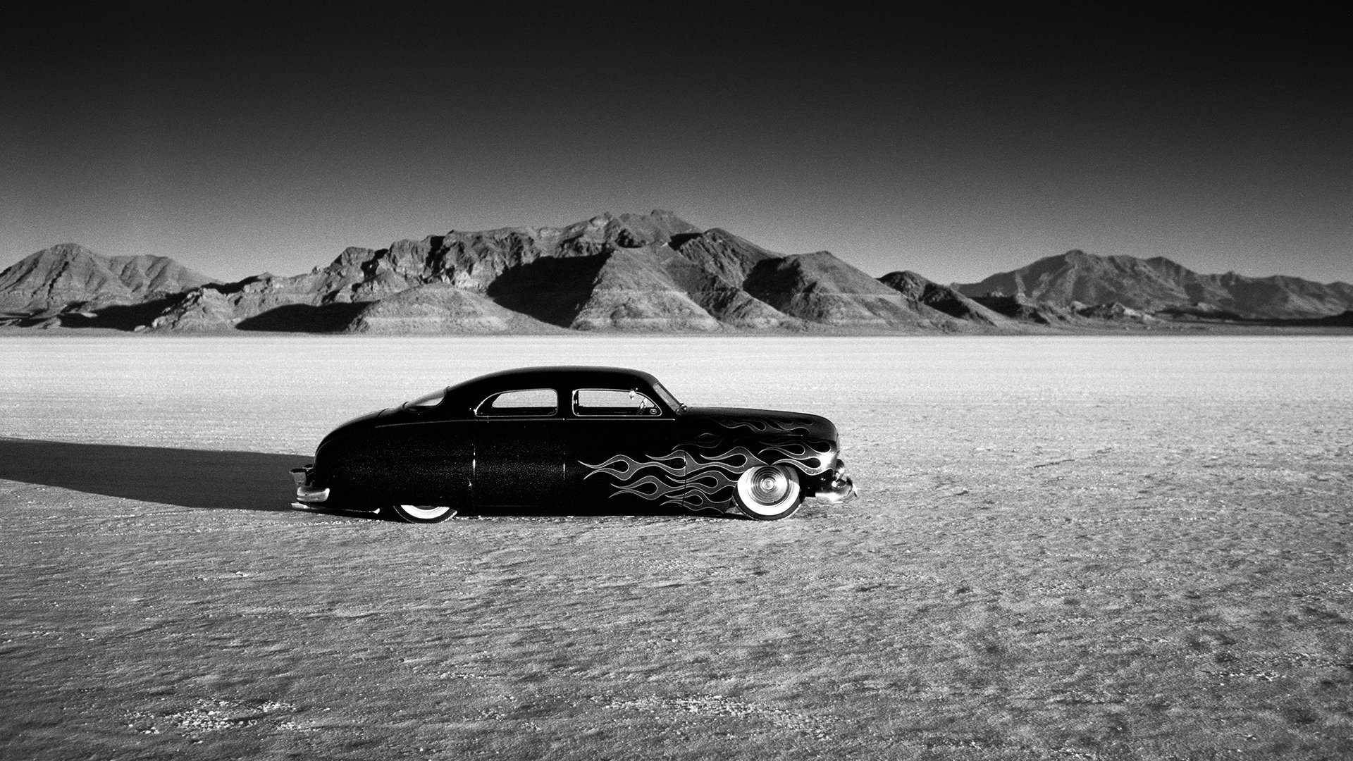 Black and white photo with a racing car on the background of mountainsBlack and white photo with a racing car on the background of mountains