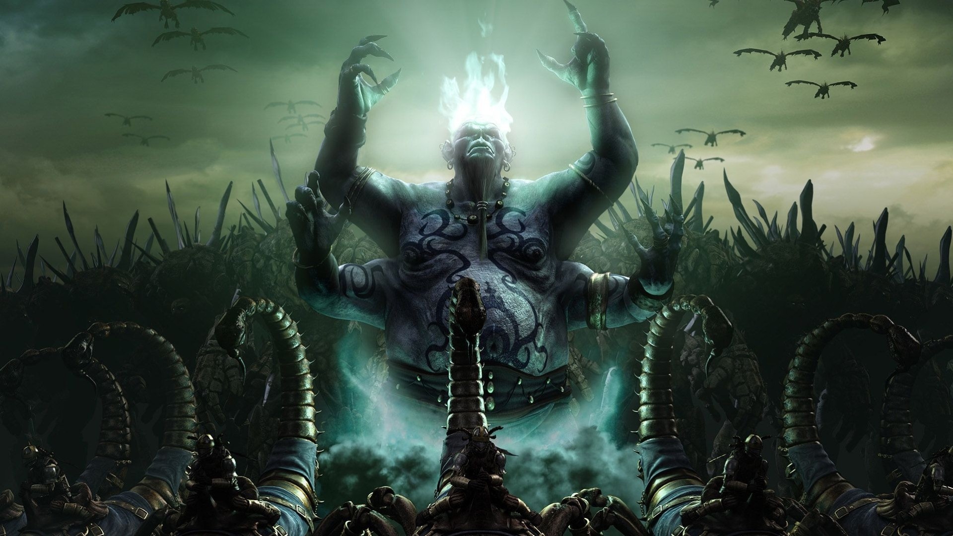 A demon with horns and tentacles with blue illuminationA demon with horns and tentacles with blue illumination