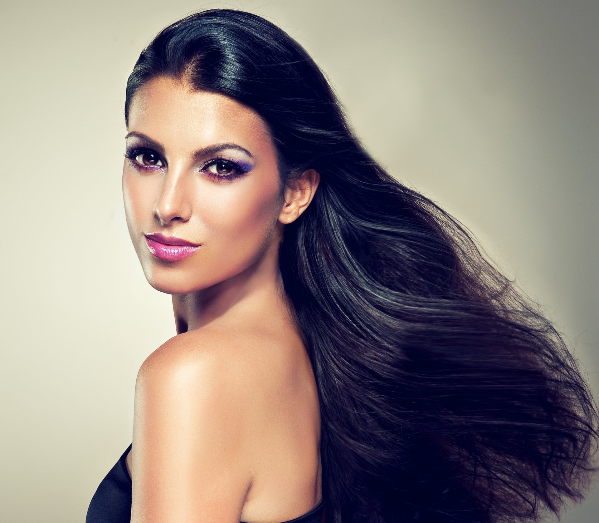 A long-haired girl with light makeup looked over her shoulderA long-haired girl with light makeup looked over her shoulder